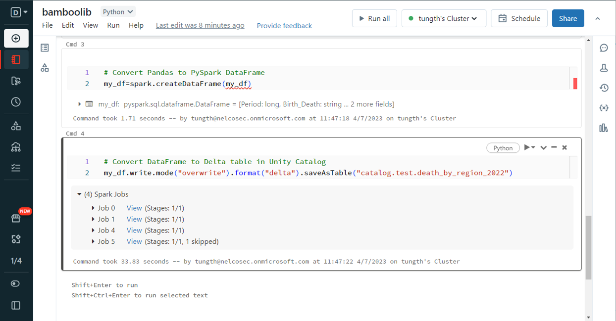 上記のコマンドを実行すると、データがUnity カタログのデルタ テーブルに保存されました。