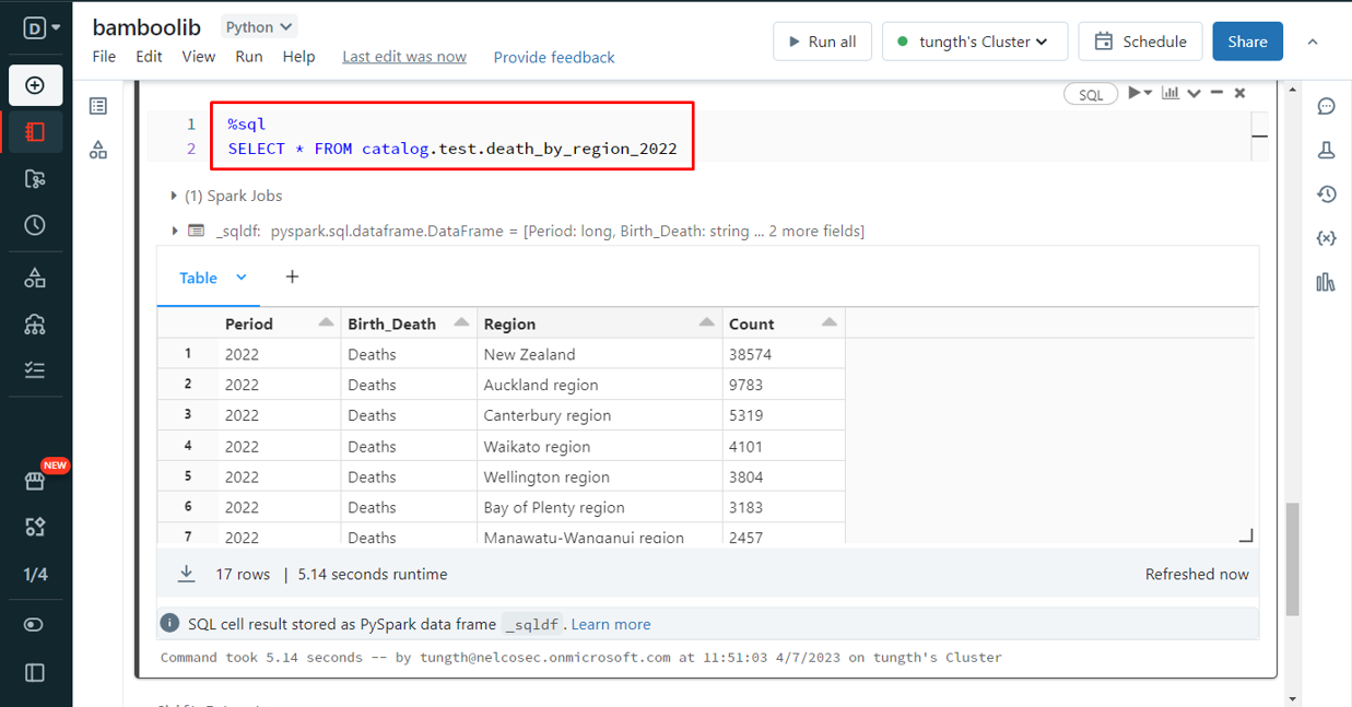 下記の SQLコマンドを実行して、DataFrame から保存したデルタ テーブルを表示します。