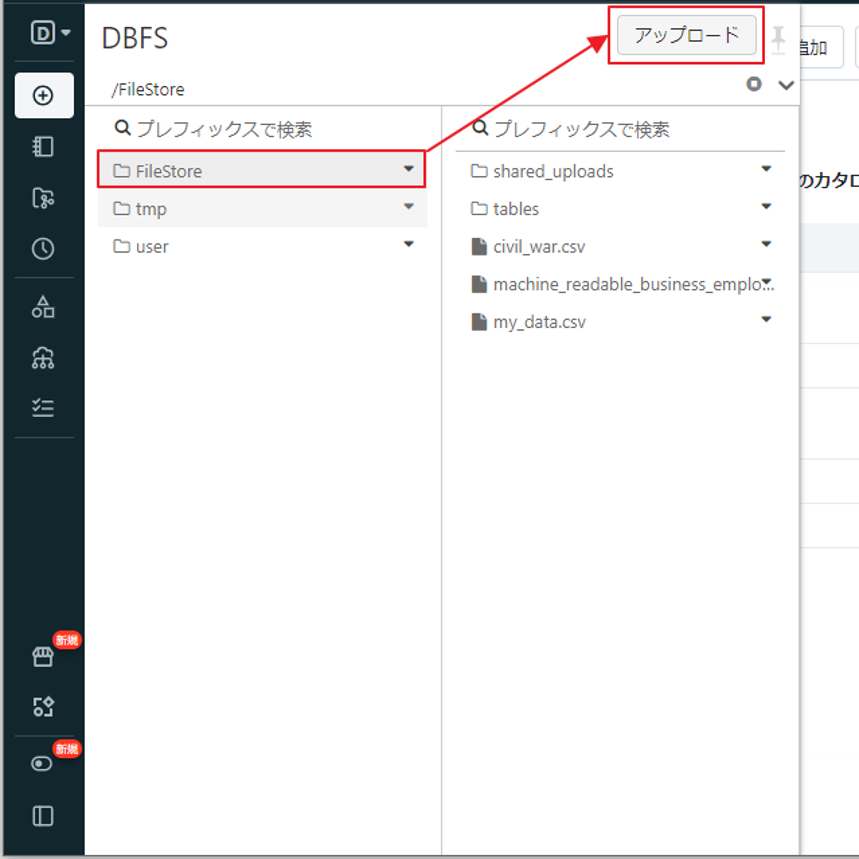 ⑤ DBFS から FileStore フォルダを選択して、「アップロード」をクリックします。