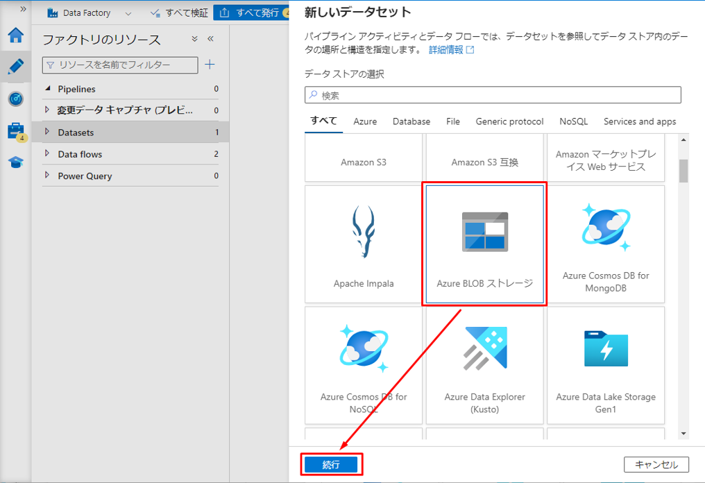 ③「新しいデータセット」ダイアログボックスで「Azure BLOBストレージ」を選択し、「実行」ボタンをクリックします。
