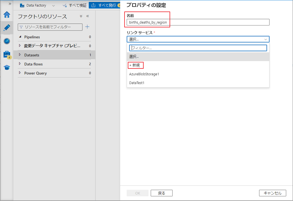 ⑤「ソースの設定」タブで、データフロー名を変更して、ストレージアカウントでアップロードしたデータセットを選択します。