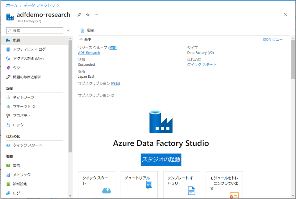 ① Azure Data Factory 画面で「スタジオの起動」をクリックしてワークスペースを起動します。