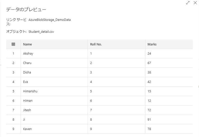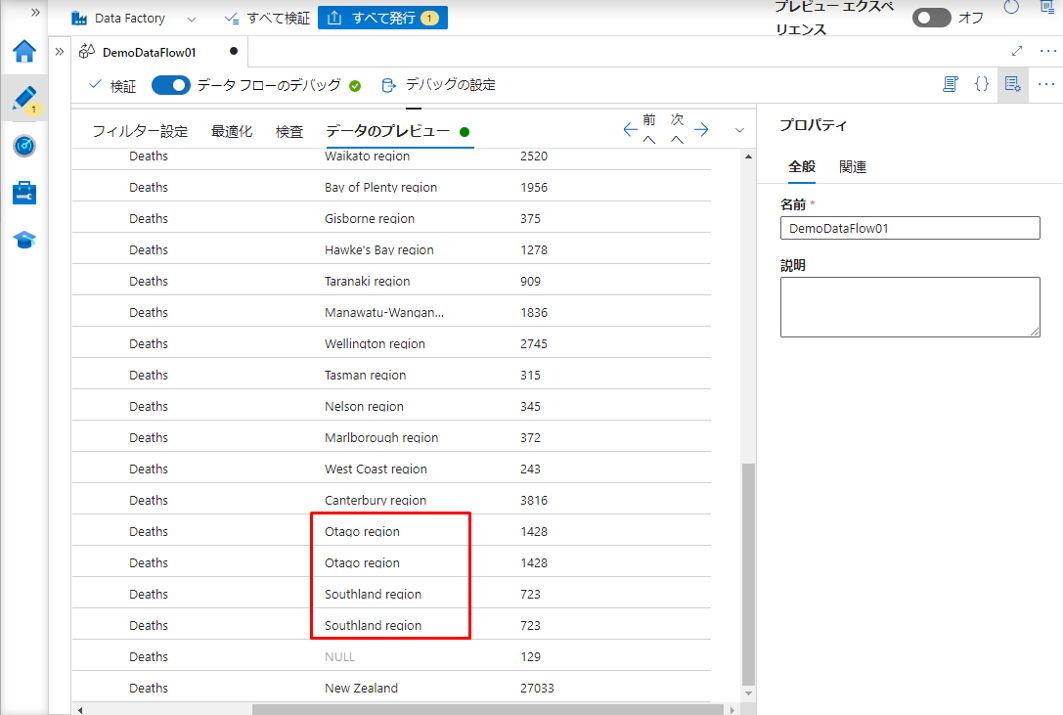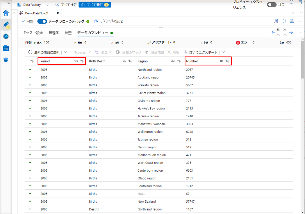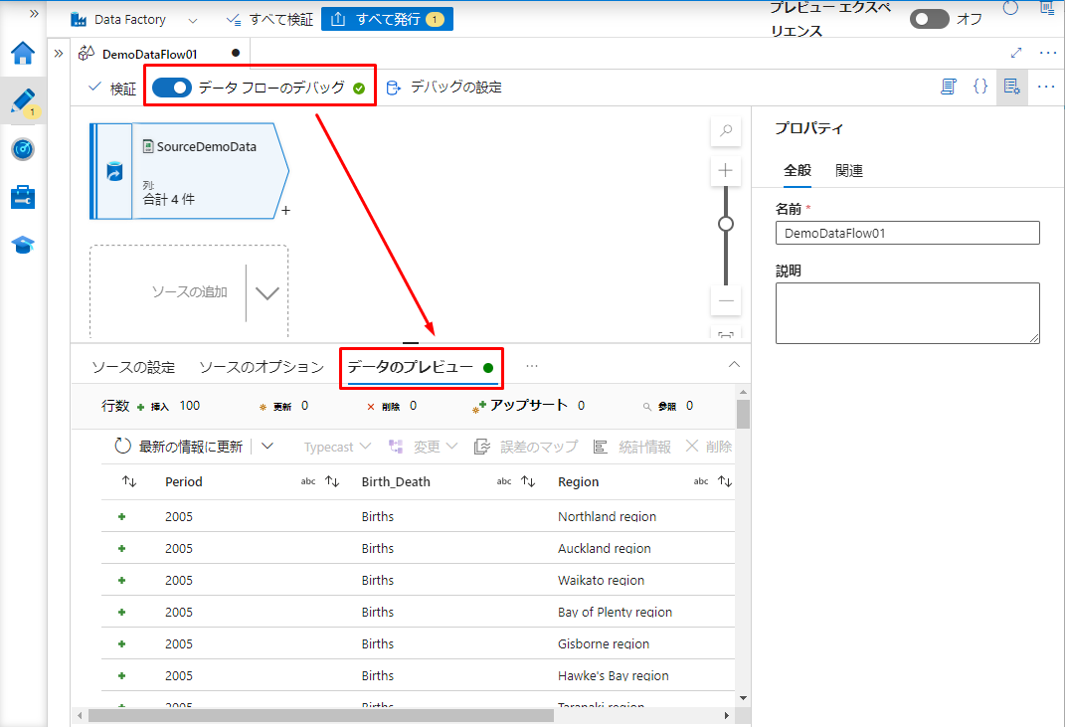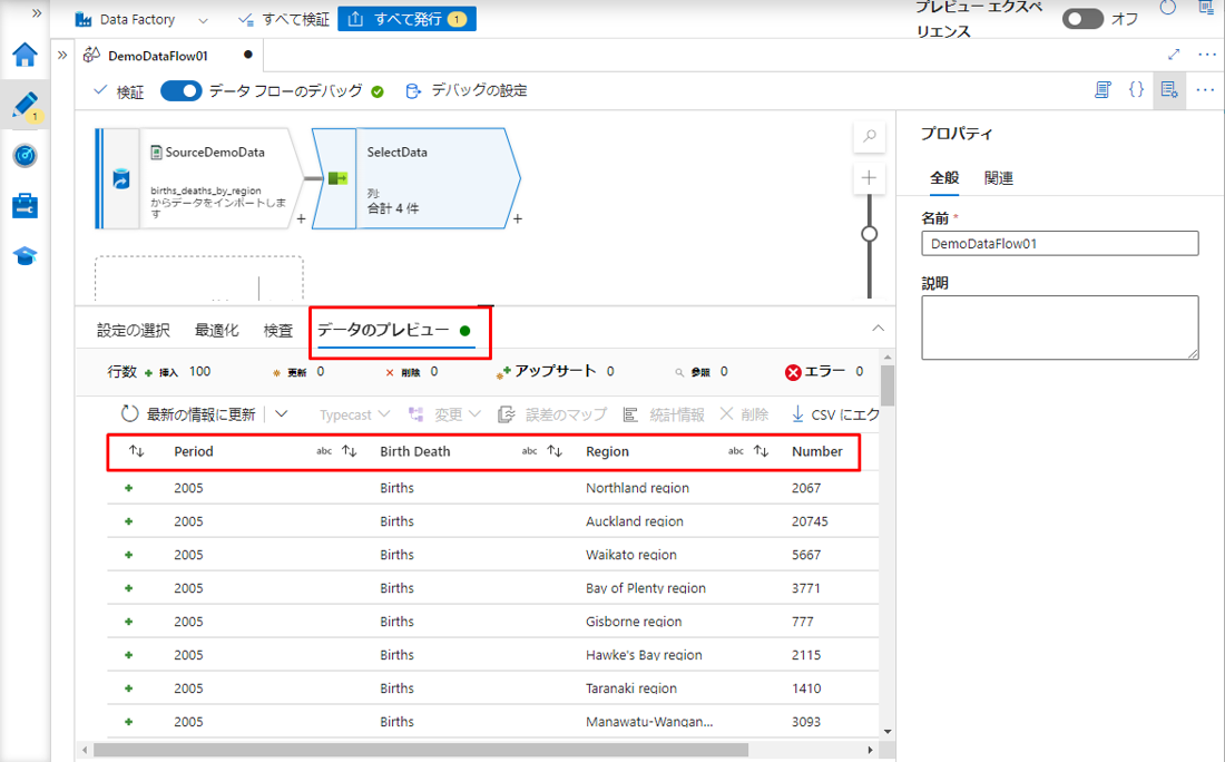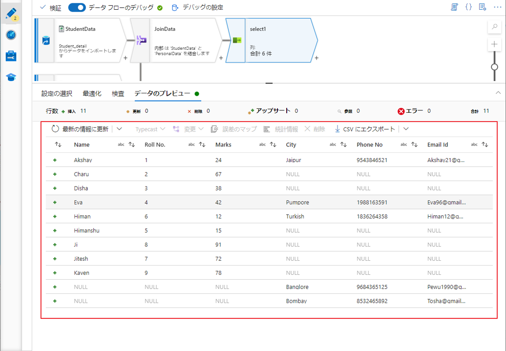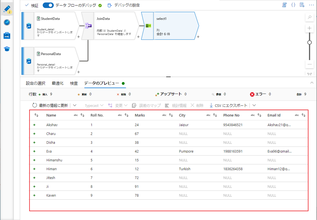 次に、データ フローのデバッグを有効にして、「データのプレビュー」タブをクリックして、CSV ファイルからインポートされたデータを確認します。