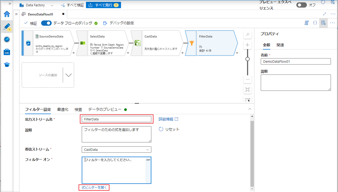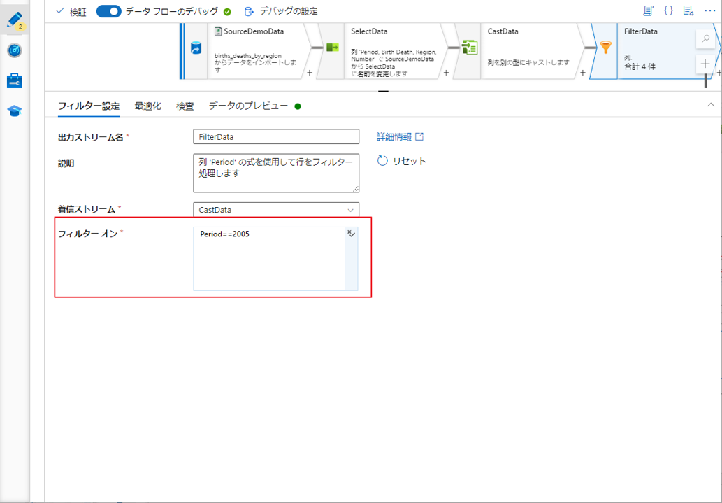 SQL の WHERE句のように条件でデータをフィルターするには、ADF でフィルター変換を使用します。