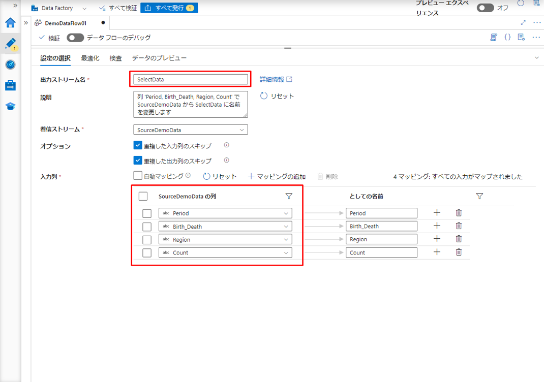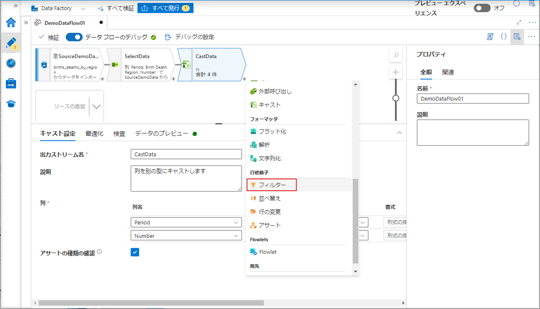 SQL の CAST のように各列のデータ型を変更するには、ADF でキャスト変換を使用します。