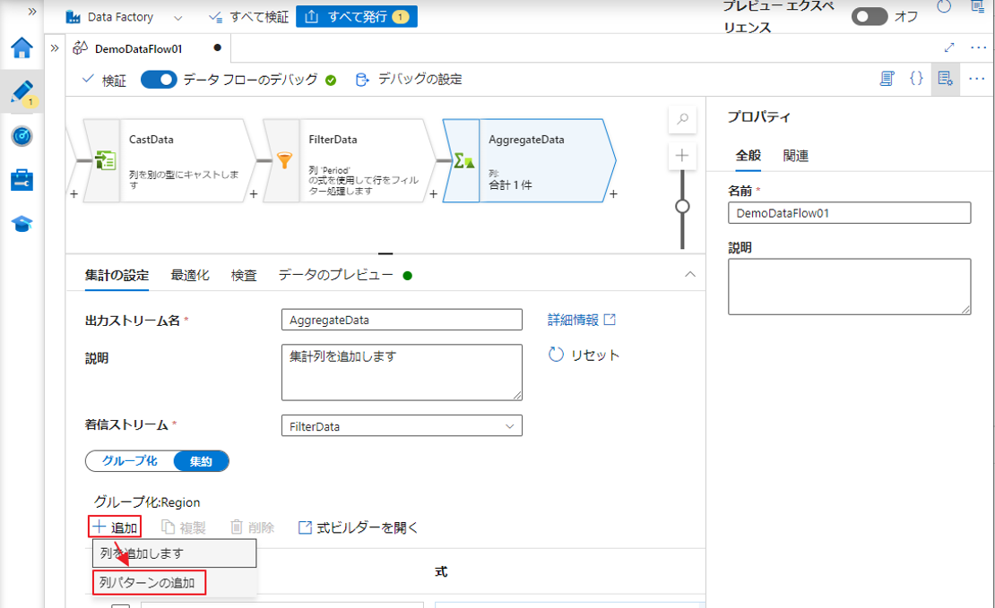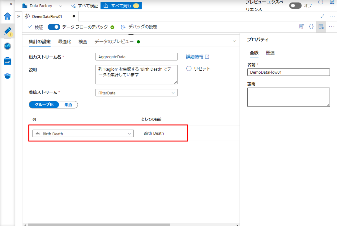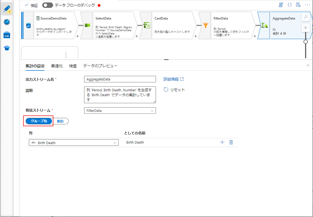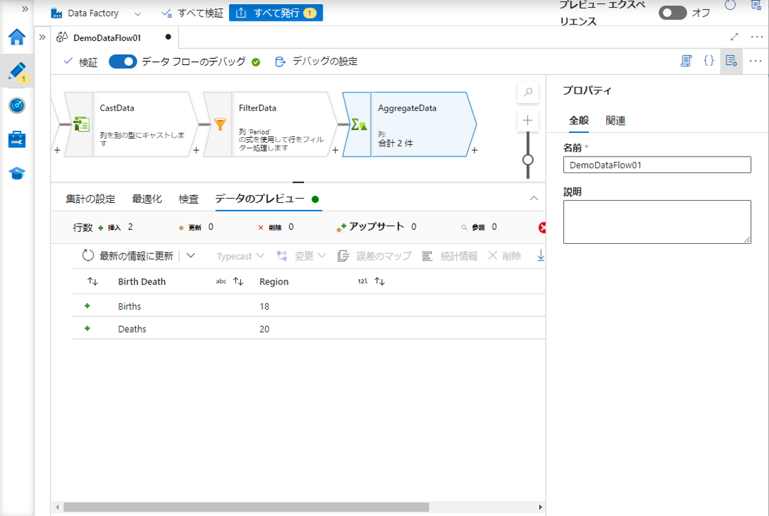 デバッグ モードを有効にする場合は、「データのプレビュー」タブで集計変換のデータをプレビューできます。