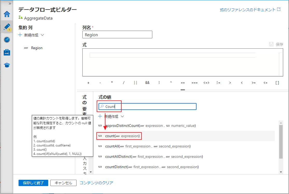 SQL の COUNT と GROUP BY のように、集計行の同じ値を持つ行数及びグループ行数をカウントするには、ADFで集計変換を使用します。