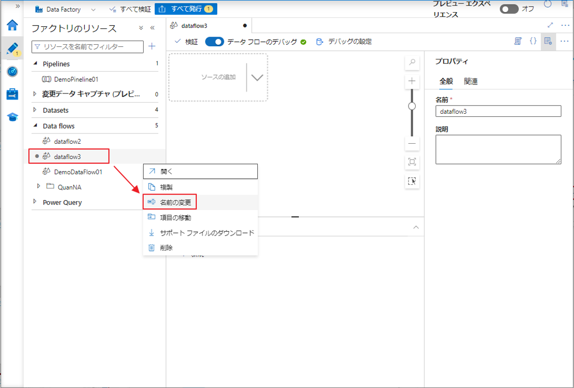 ②「名前の変更」をクリックしてデータフローの名前を変更します。