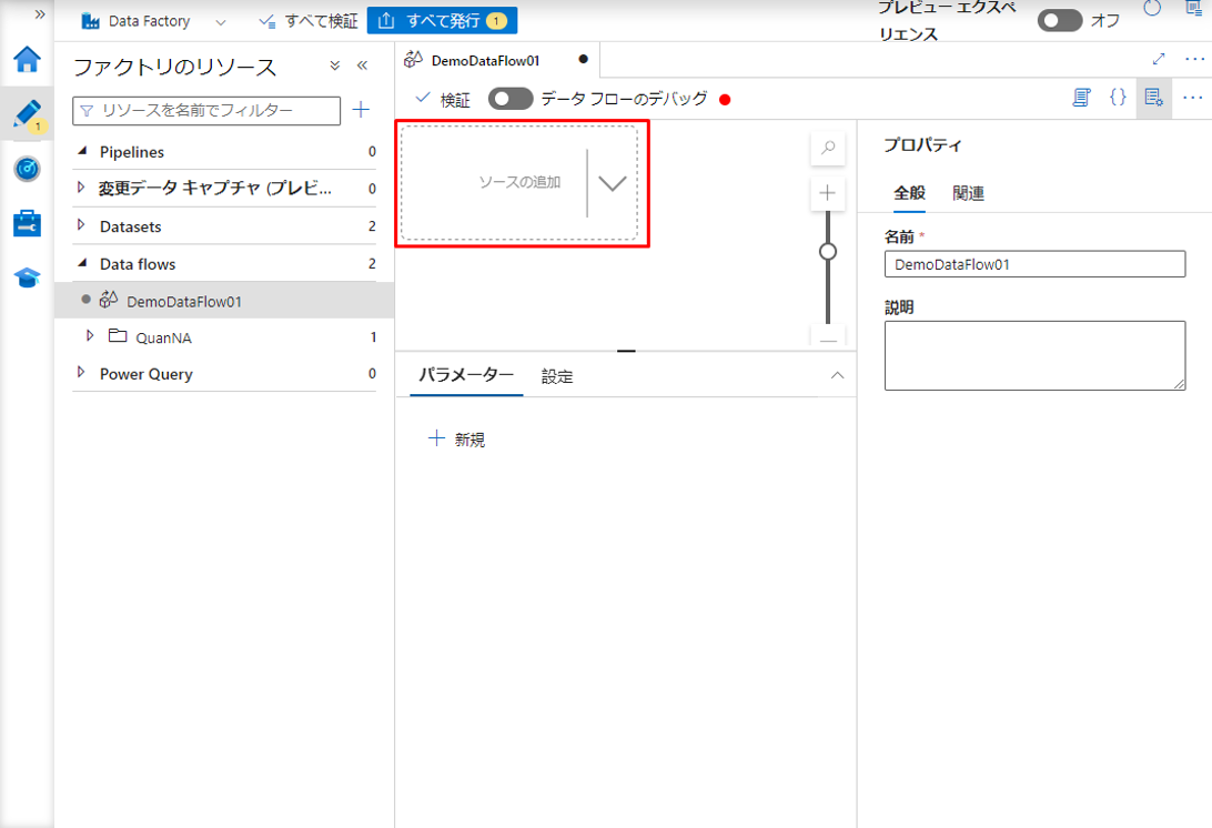 ④ データ フローの画面で「ソースの追加」をクリックし、2つのテーブルに対応する 2 セットのソース データを作成して、結合します。