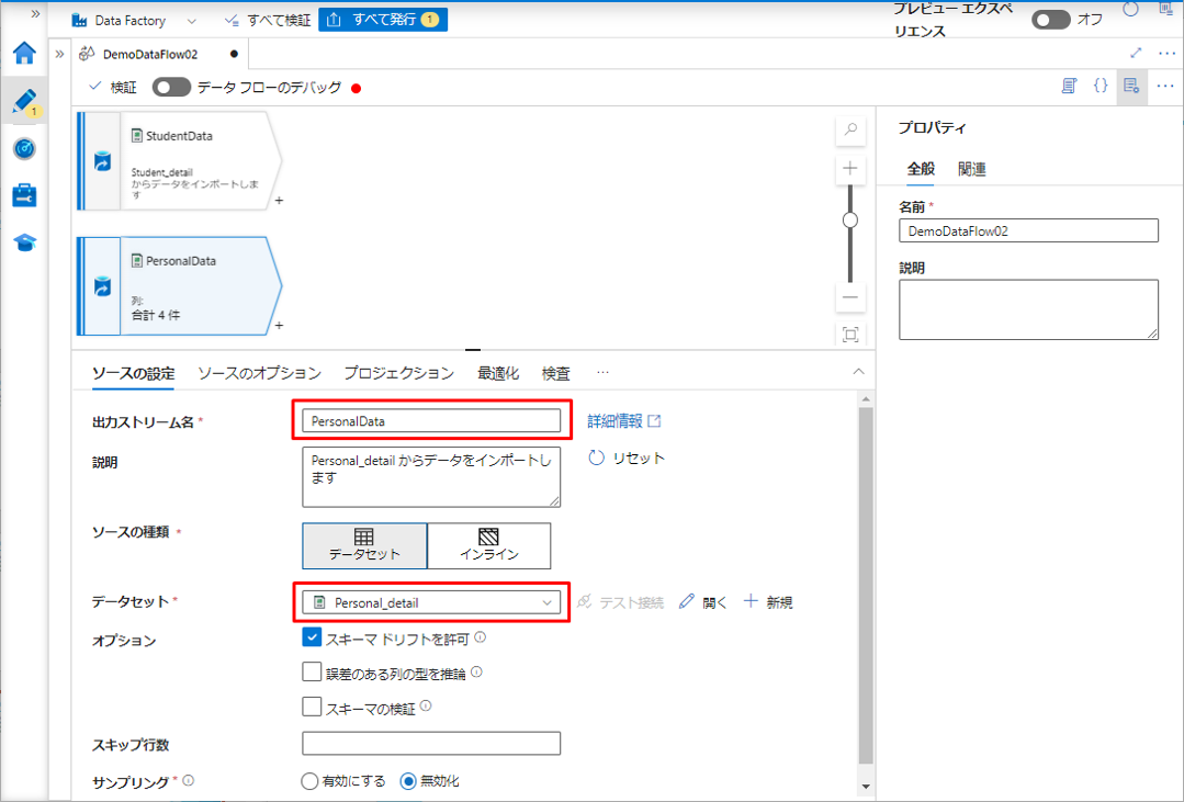 ⑥「ソースの設定」タブで、名前を変更して、データ セットを選択します。((画像に表しているのはPersonal_detail テーブルです。)