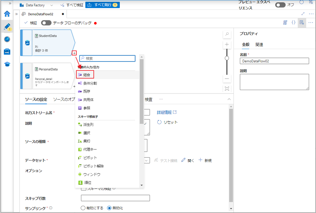 SQL の JOIN結合のように、結合の列を元に2つ以上のテーブルを結合するには、ADF で結合変換を使用します。