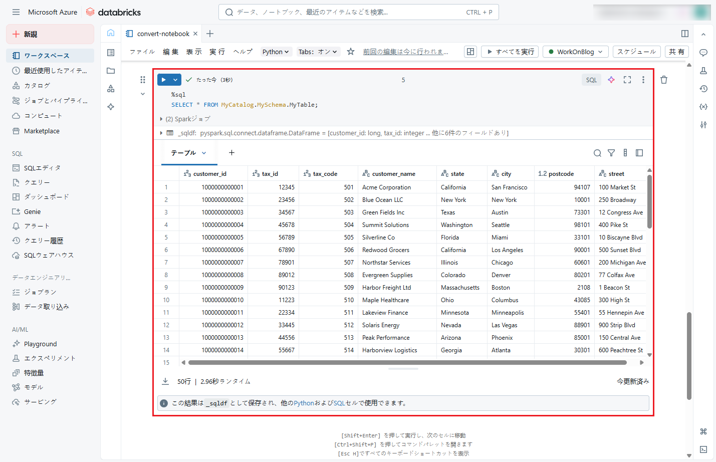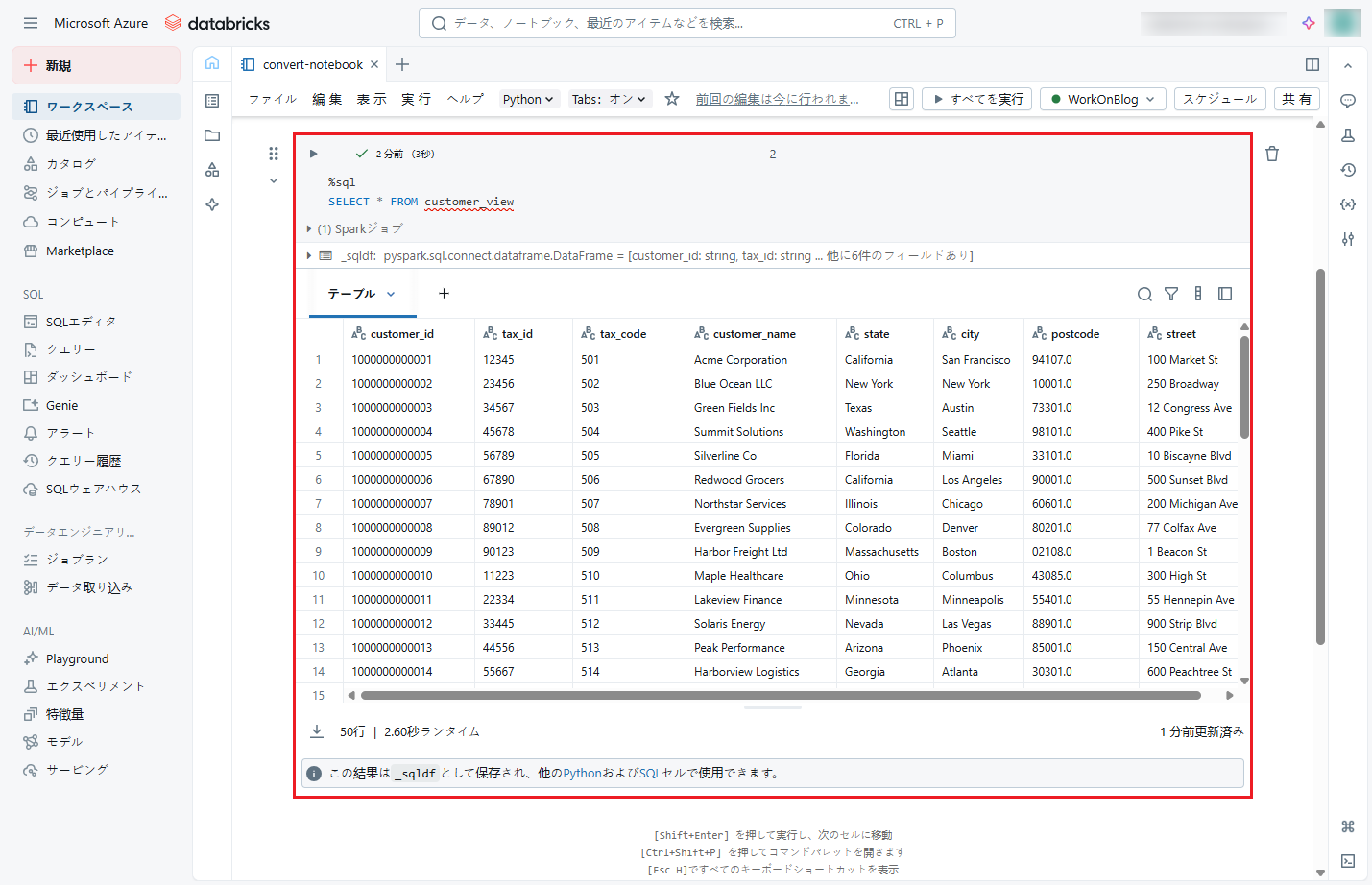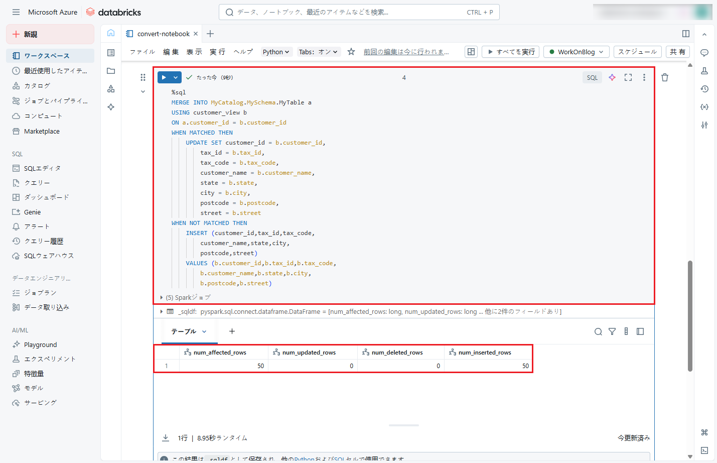 ⑪ データがテーブルにマージされたかどうかを確認するために、以下のコマンドをノートブックにコピーし、「Shift + Enter」を押して実行します。