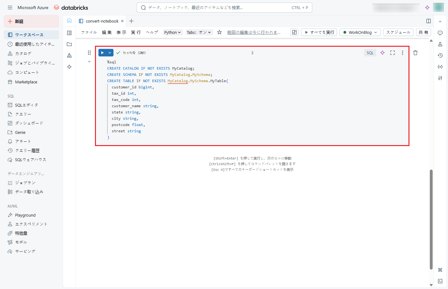 実行後、「MyCatalog」のカタログ、「MySchema」のスキーマ、「MyTable」のテーブル が作成されします。