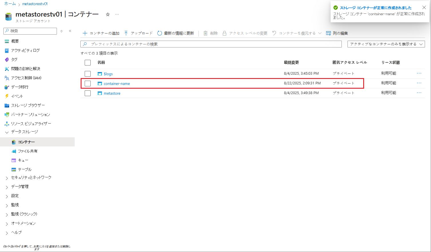 サイドバーで「コンテナー」を選択し、「コンテナー」をクリックします。