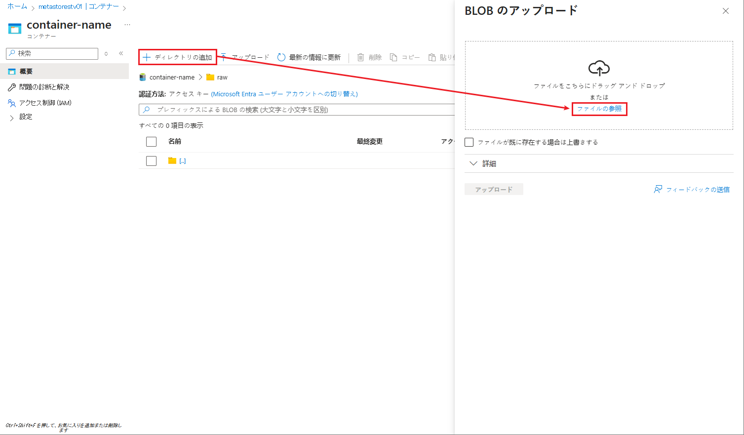 ストレージア カウントの画面でコンテナーを作成し、CSVファイルを格納します。