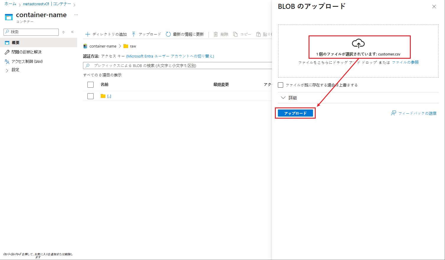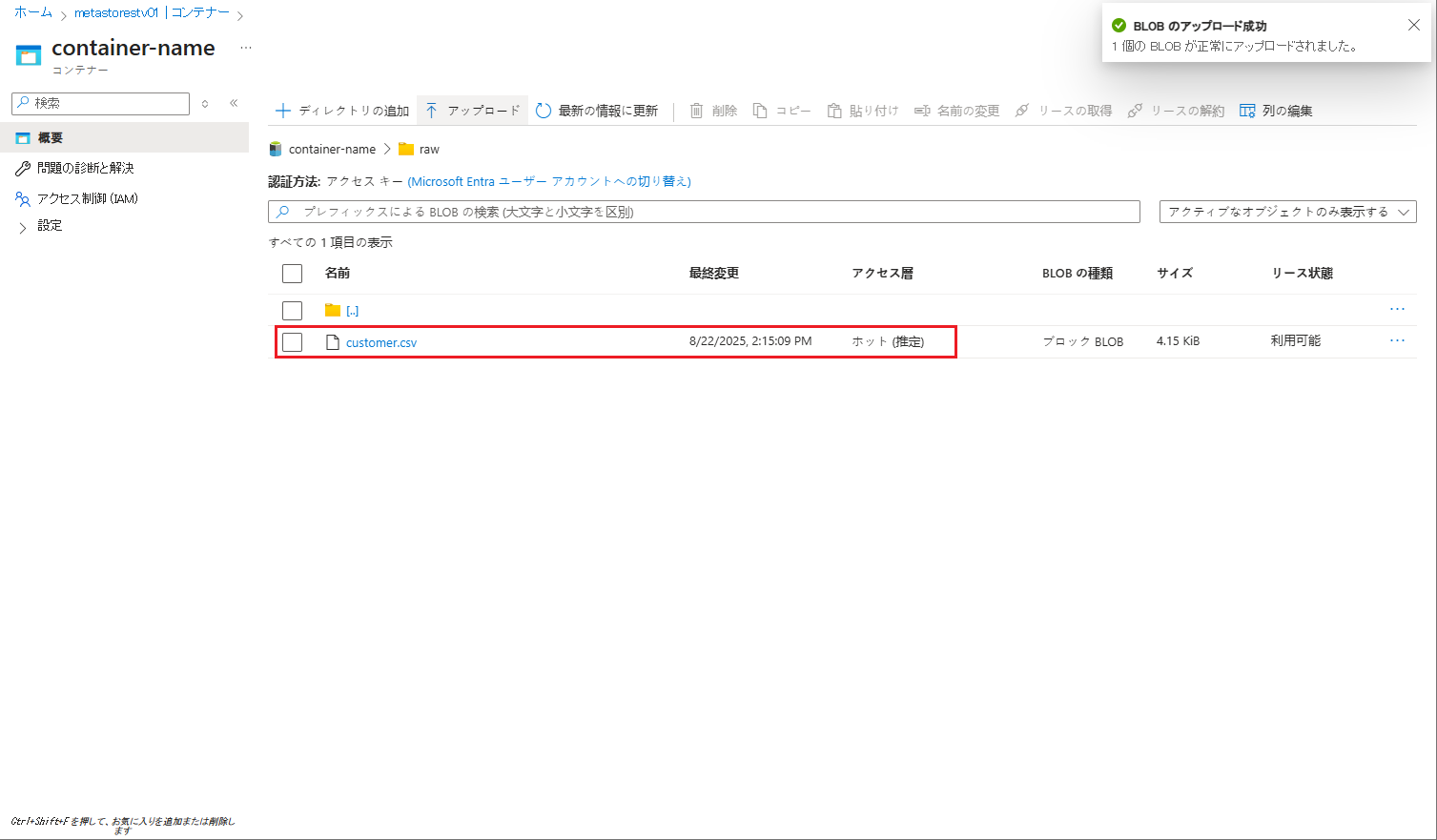 ストレージ アカウントの「raw」フォルダーにcustomer.csv ファイルがアップロードされました。