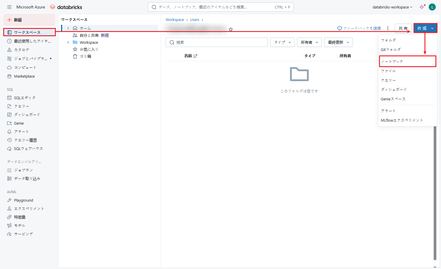 ワークスペースでノートブックを作成してCSVファイルを読み込みます。次に、 Unity Catalog でテーブルを作成して、CSVファイルをマージします。