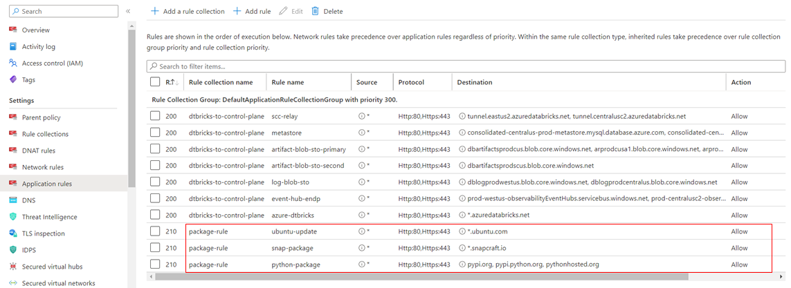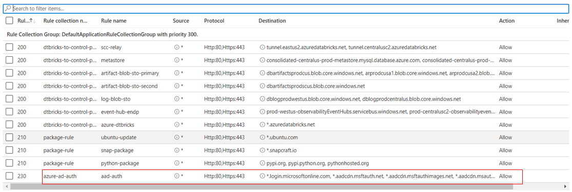 Databricksワークスペースのデプロイ時に、コントロールプレンへの接続が必要なので、UDRとファイアウォールのルールを優先で作成します。