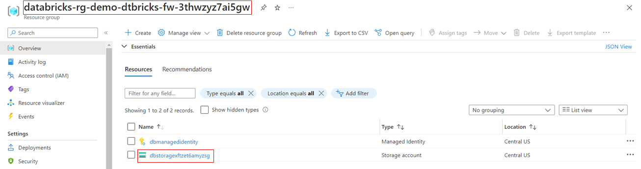 「databricks-<databrick_name>-<random_id>」リソースグループに移動します。本書では、Databircksの名が「demo-dtbricks-fw」なので、対象のリソースグループ名を「databricks-rg-demo-dtbricks-fw-<random-id>」にします。