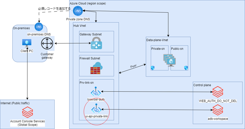・ ui-api private link: トランジットVnetからメインワークスペースのコントロールプレンのウェブへ接続します。または、データプレンからメインワークスペースコントロールプレンへ接続します。