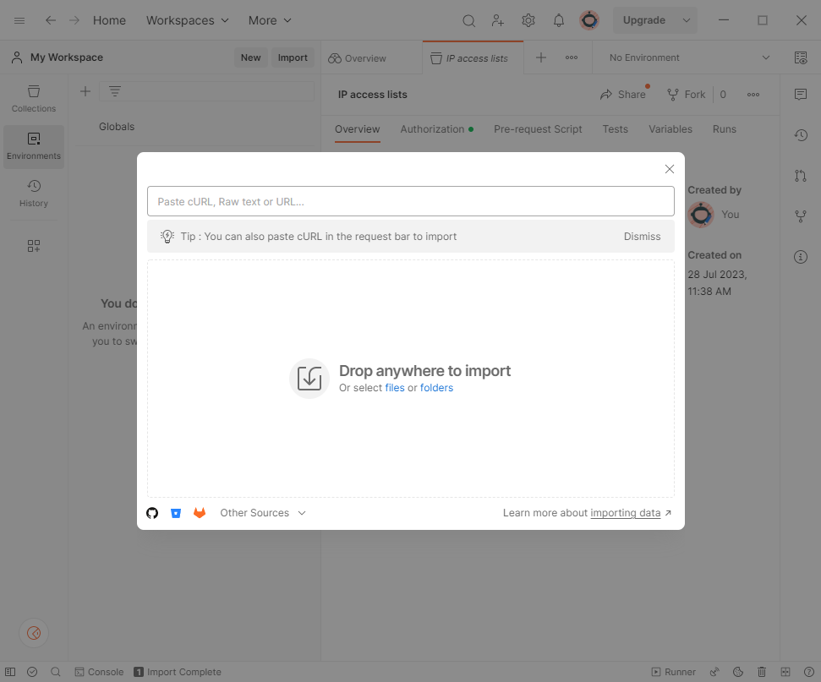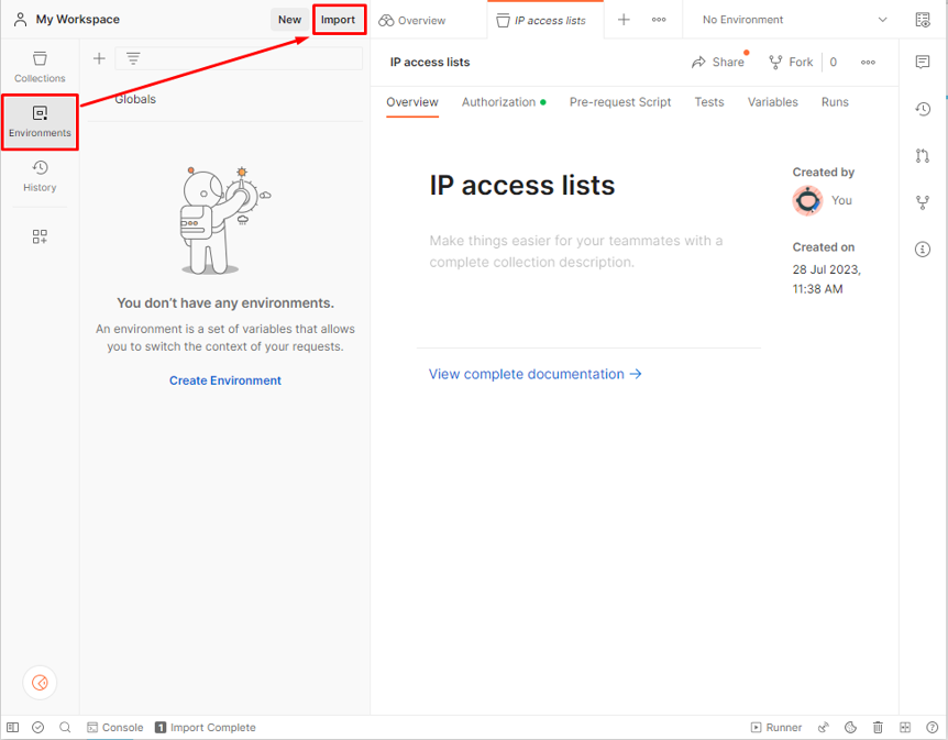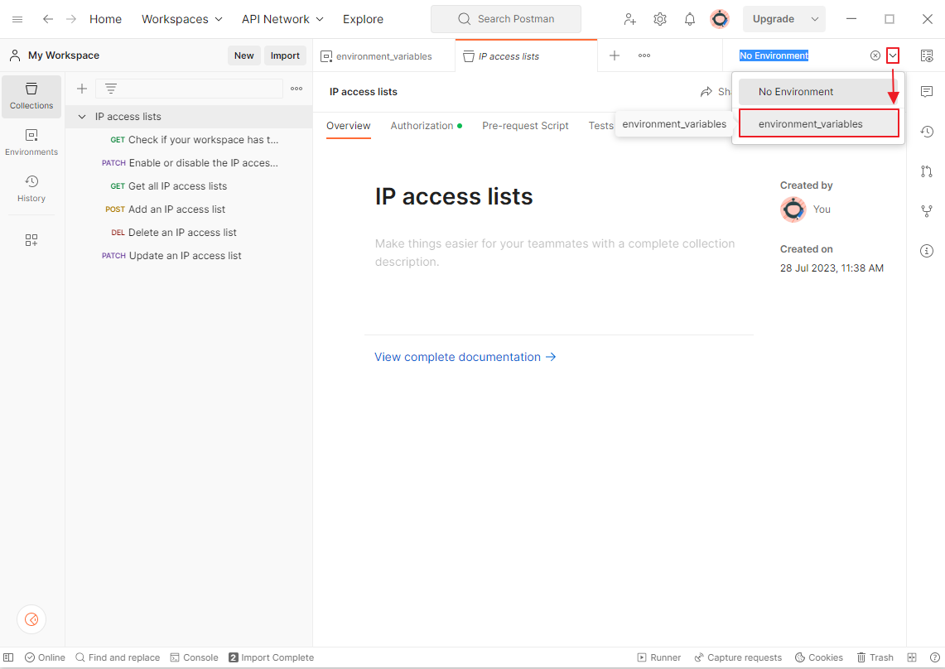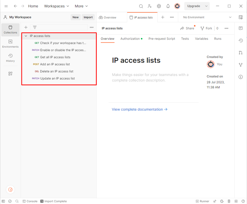 IP access lists.postman_collection.jsonファイルをダウンロードする。