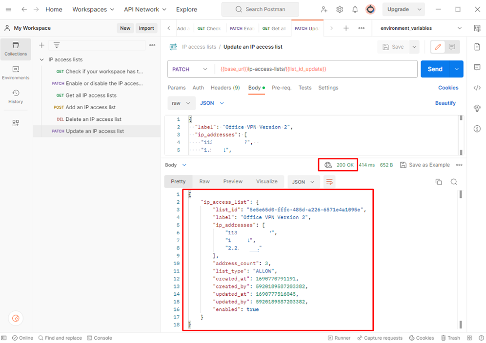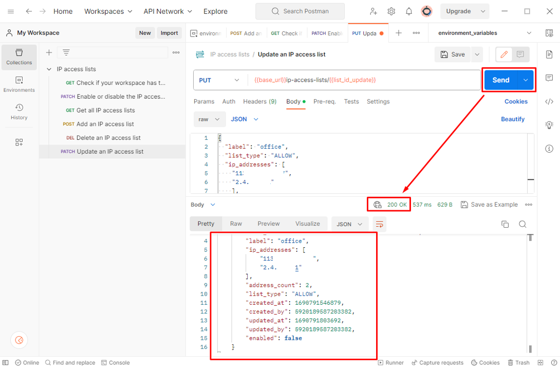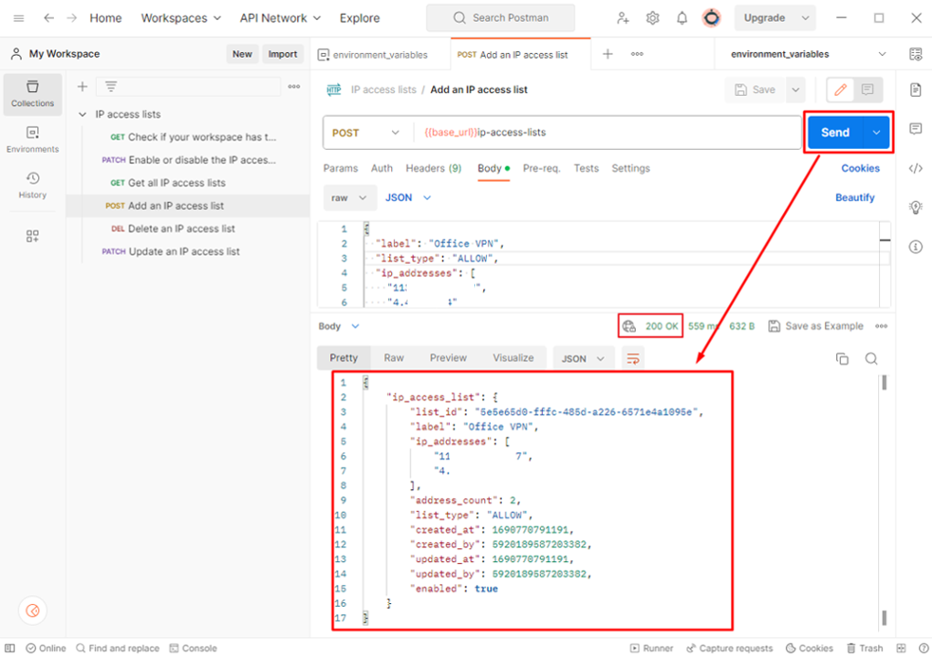 ⑦「Send」をクリックしてリクエストを送信すると、IP アクセス リストが正常に更新されたというレスポンスが返却されます。