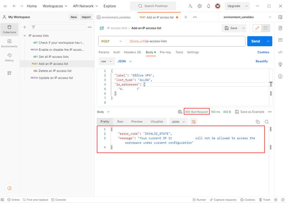 注意:新規リストが呼び出し元の現在のIPアドレス をブロックする場合、error_code が「INVALID_STATE」のエラー 400 が返却されます。