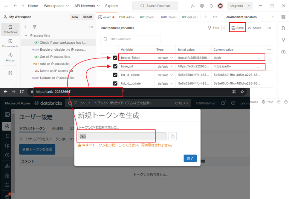 ⑥「environment_variables」環境で、bearer_Token変数とbase_url変数の「Initial value」列と「Current value」列の値を変更し、「Save」をクリックします。