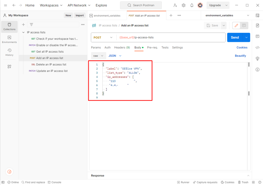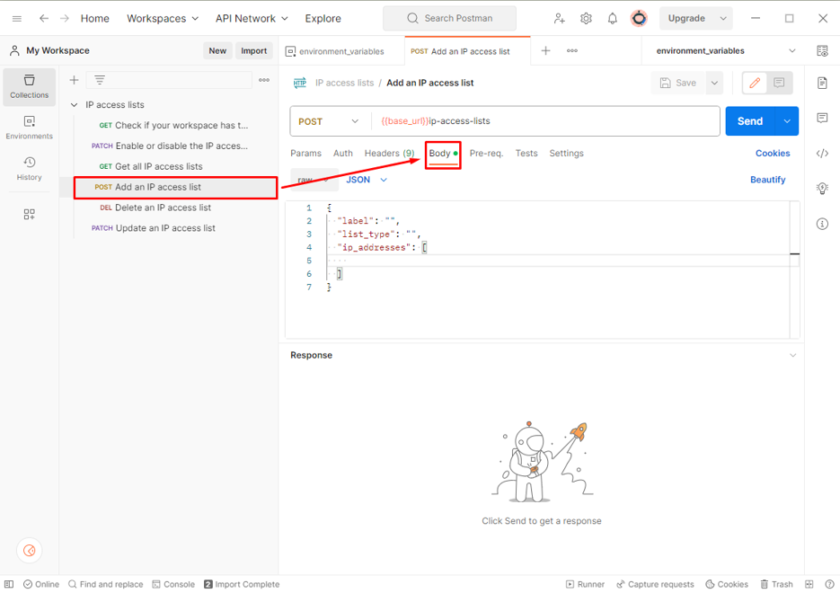 ①「Add an IP access list」リクエストをクリックして、「Body」タブをクリックします。