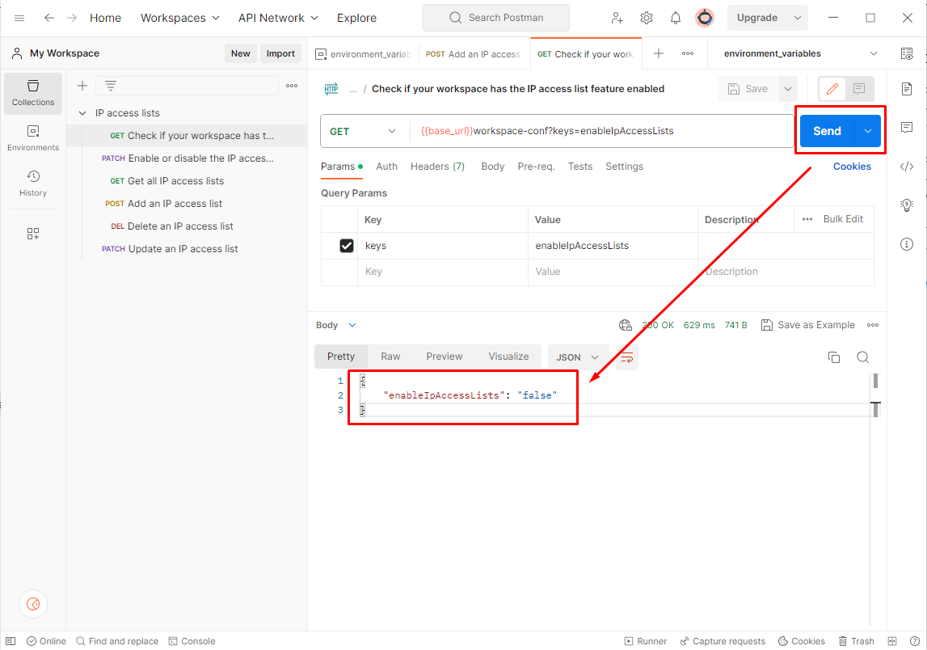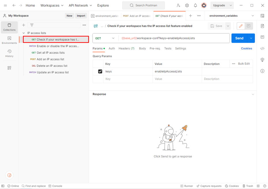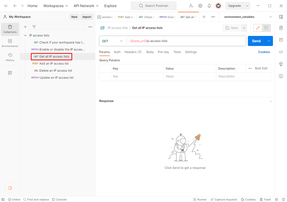 ①「IP access lists」コレクションで「Get all IP access lists」リクエストをクリックします。