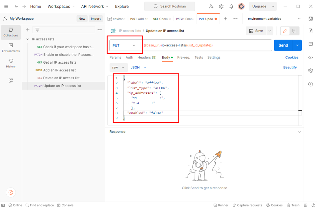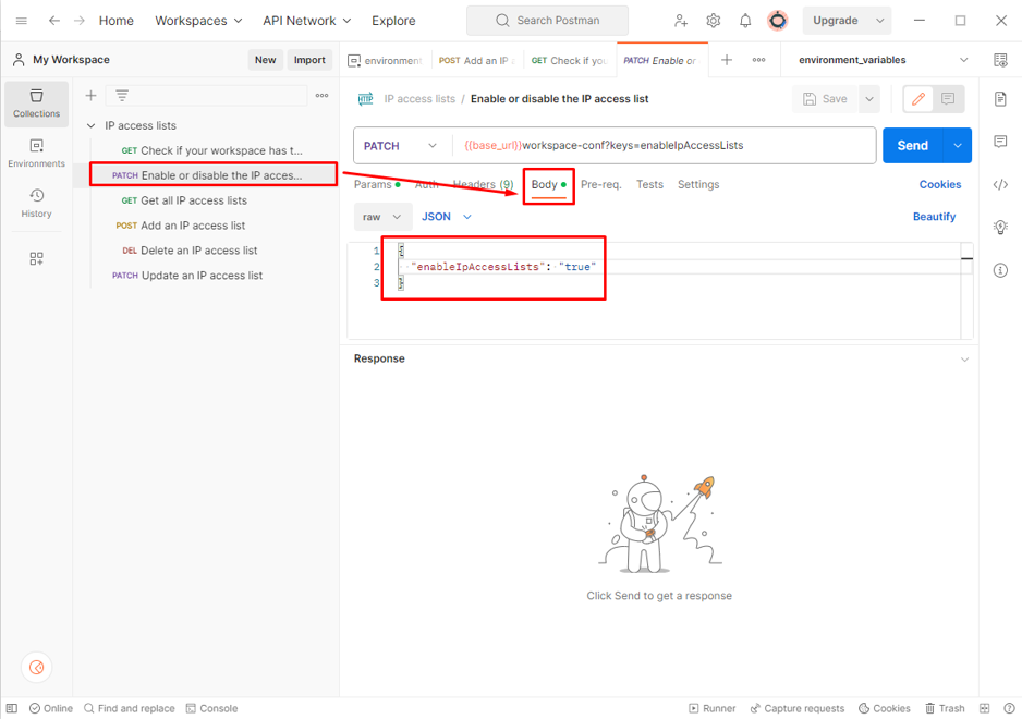 ⑤「IP access lists 」コレクションで「Enable or disable the IP access list」リクエストをクリックして、「Body」タブをクリックします。