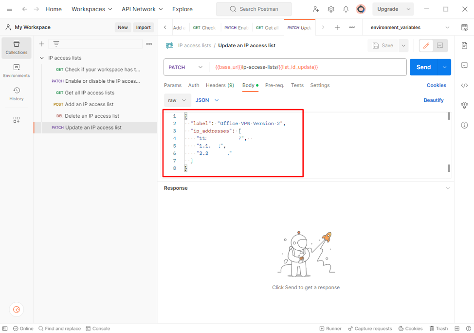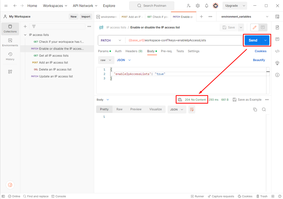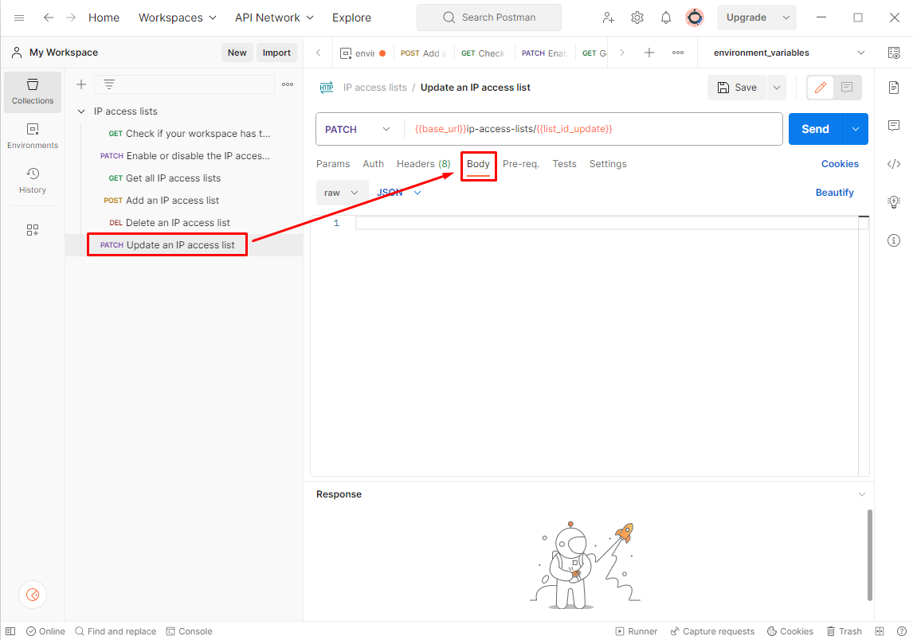 ①「IP access lists」コレクションで「Enable or disable the IP access list」リクエストをクリックして、「Body」タブをクリックします。