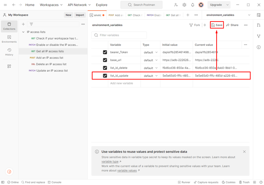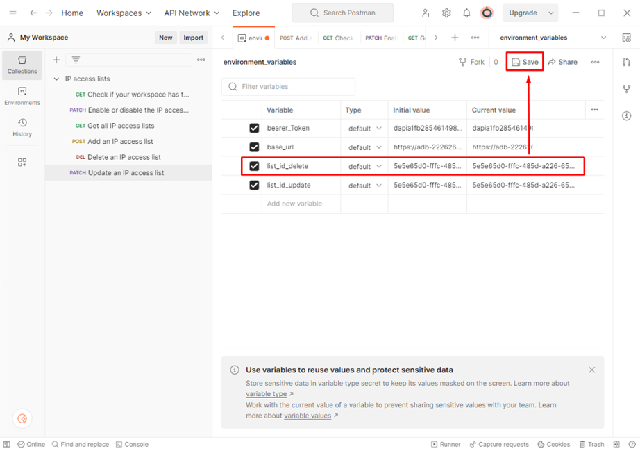③「environment_variables」環境で、コピーした値を list_id_delete 変数の「Initial value」列と「Current value」列に貼り付けて、「Save」をクリックします。