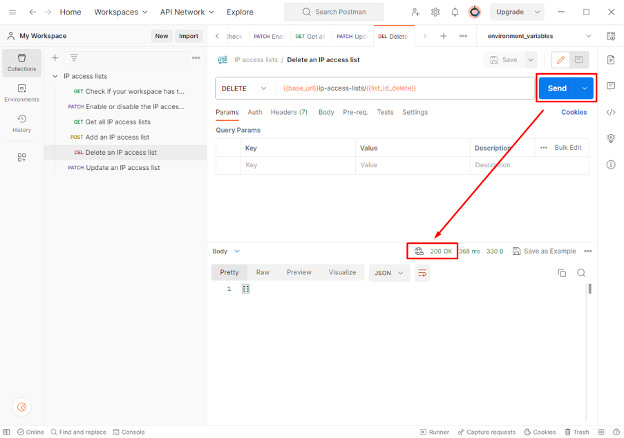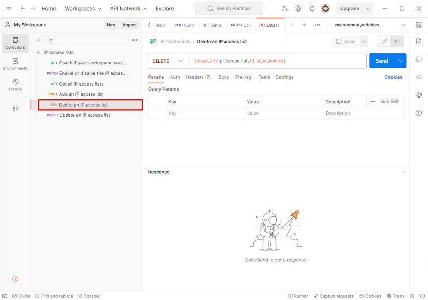 ④「IP access lists」コレクションで「Delete an IP access list」リクエストをクリックします。