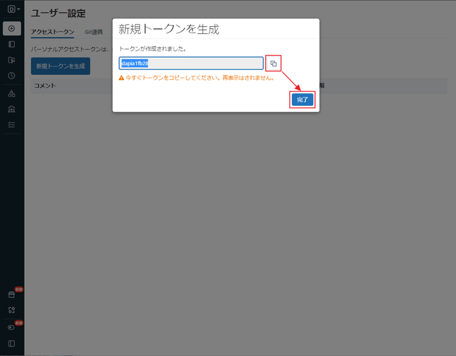 コピーしたトークンは必ず安全な場所に保存してください。 コピーしたトークンを失った場合、それとまったく同じトークンは再生成できません。