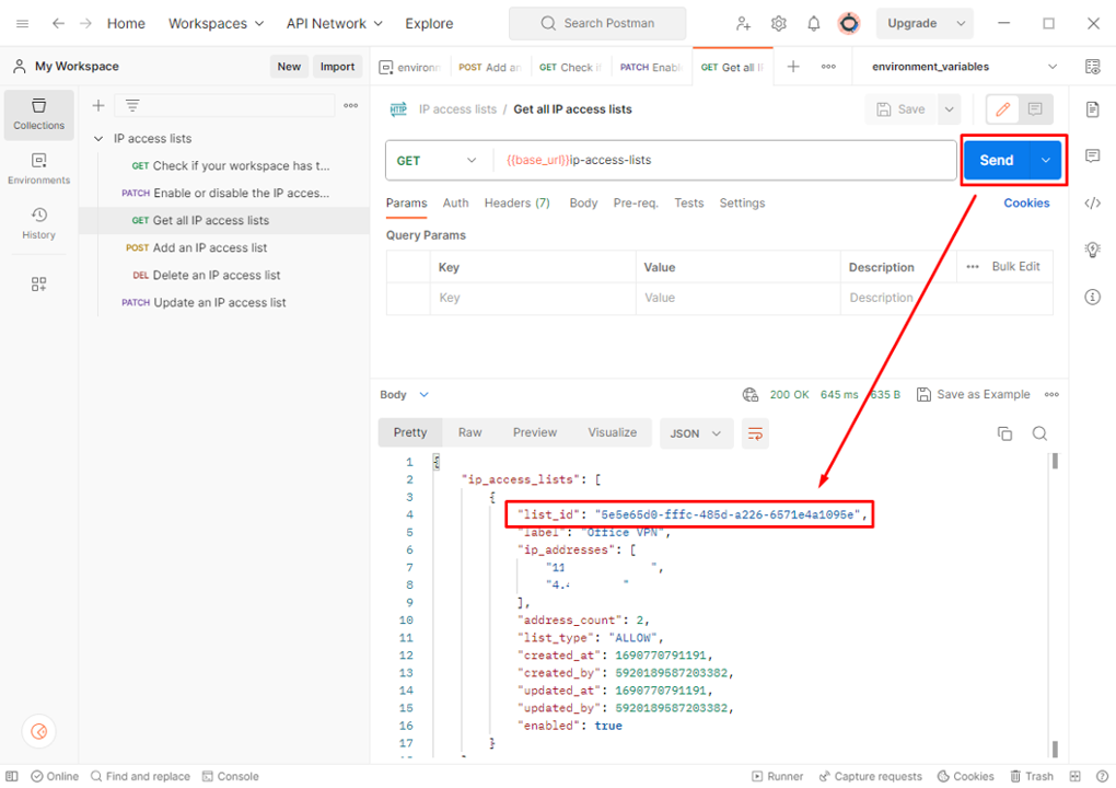 ②「Send」をクリックしてリクエストを送信すると、全ての IP アクセス リストの ID が取得されます。