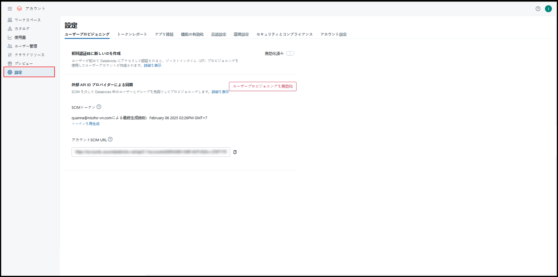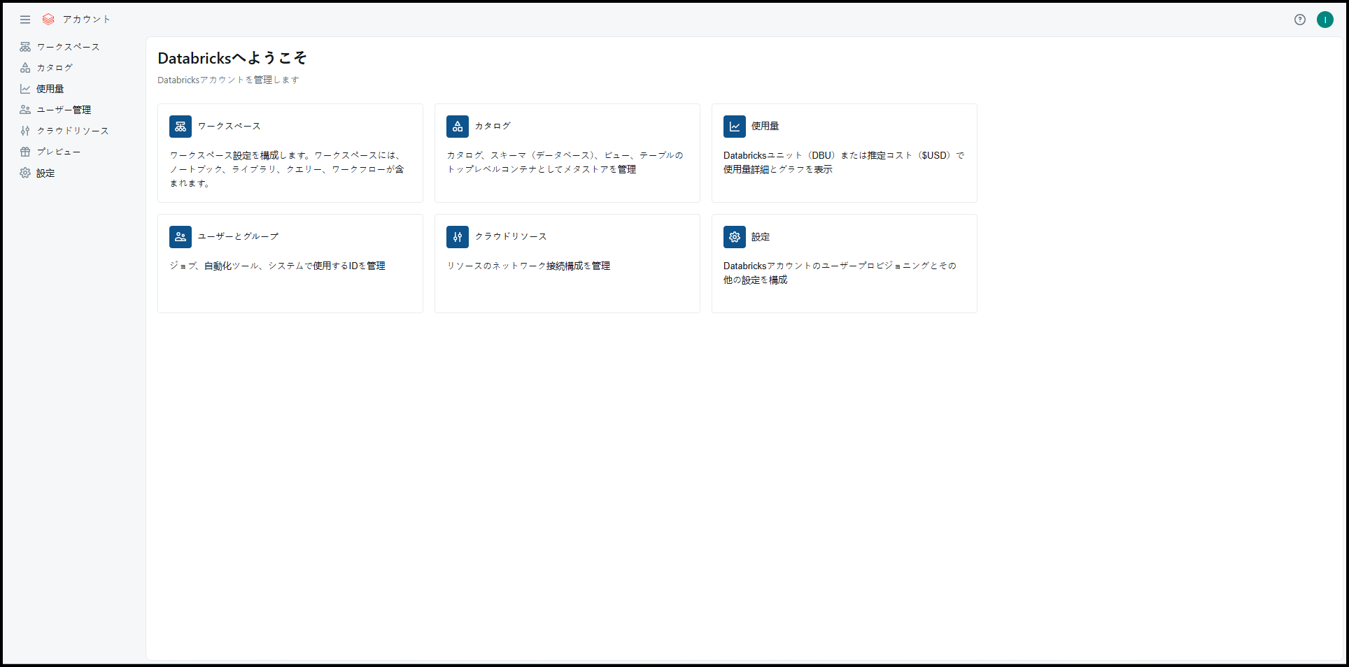 ・操作ユーザーは Azure Databricksの管理者アカウントとしてアカウント コンソールへアクセス権限があること。権限が付与されていない場合、管理者に権限を付与してもらう様に依頼してください。