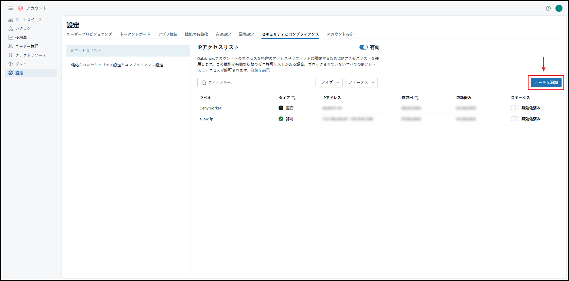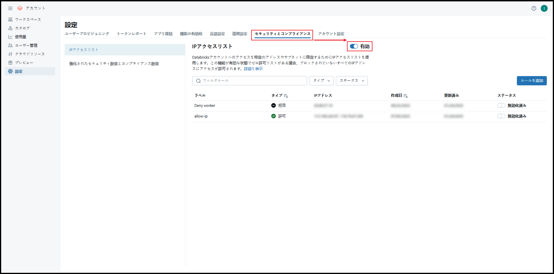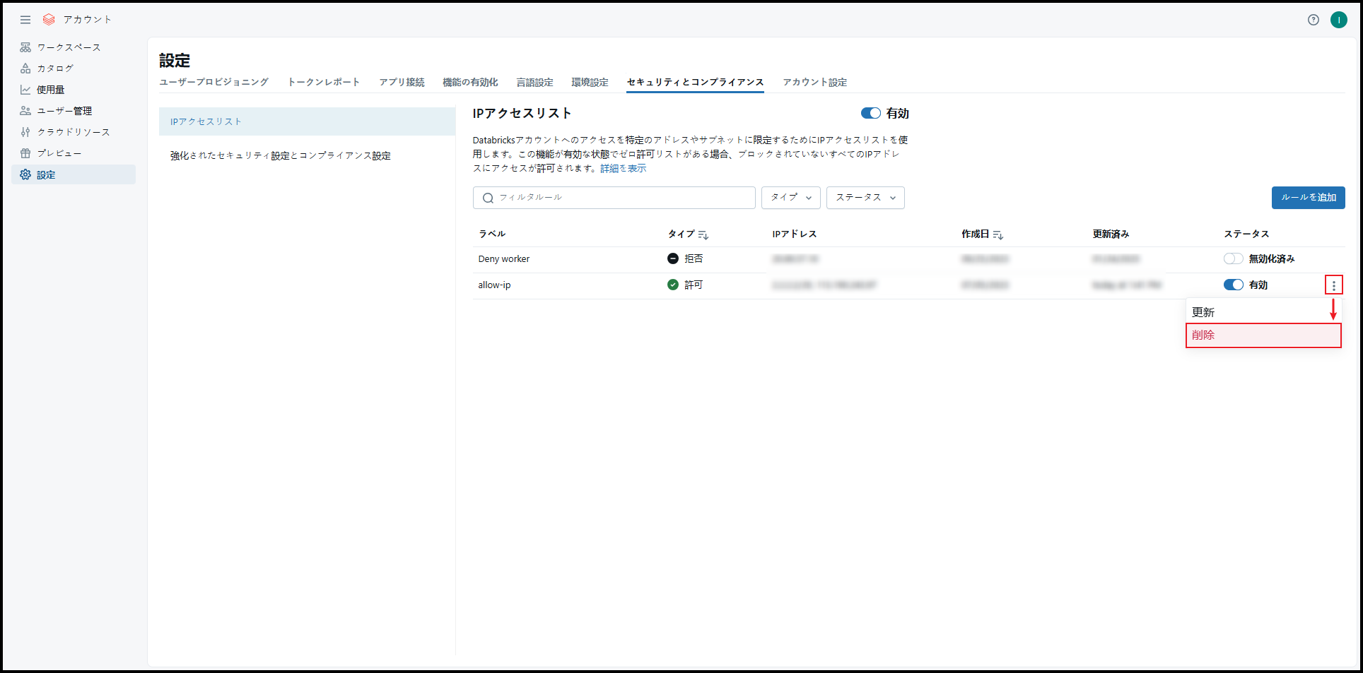 Databricks のアカウントコンソールへのアクセスを許可するIPアドレス範囲を限定するためにIP アクセス リストの使用方法について説明しました。