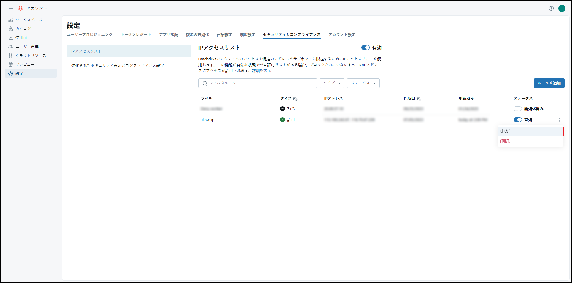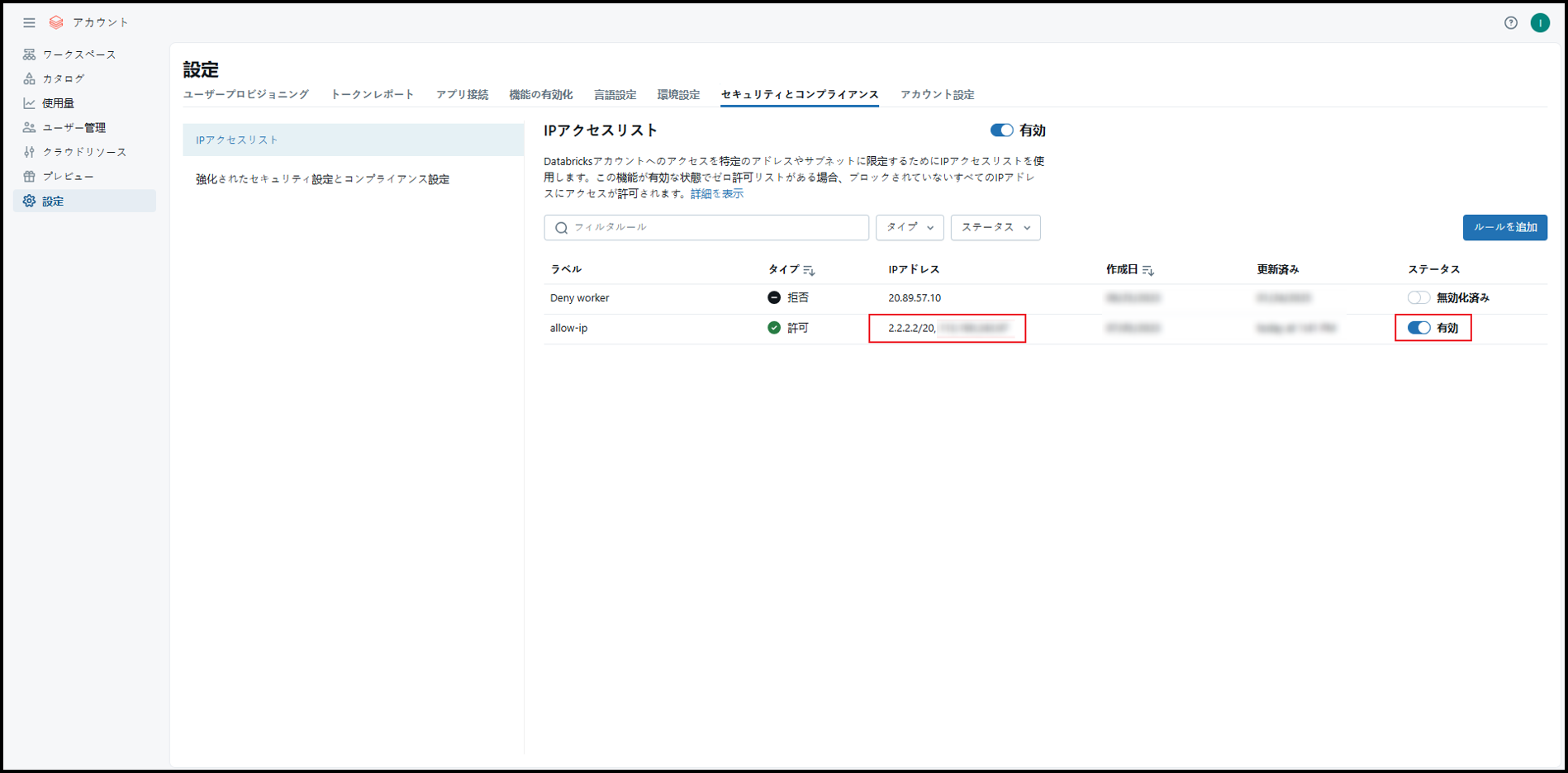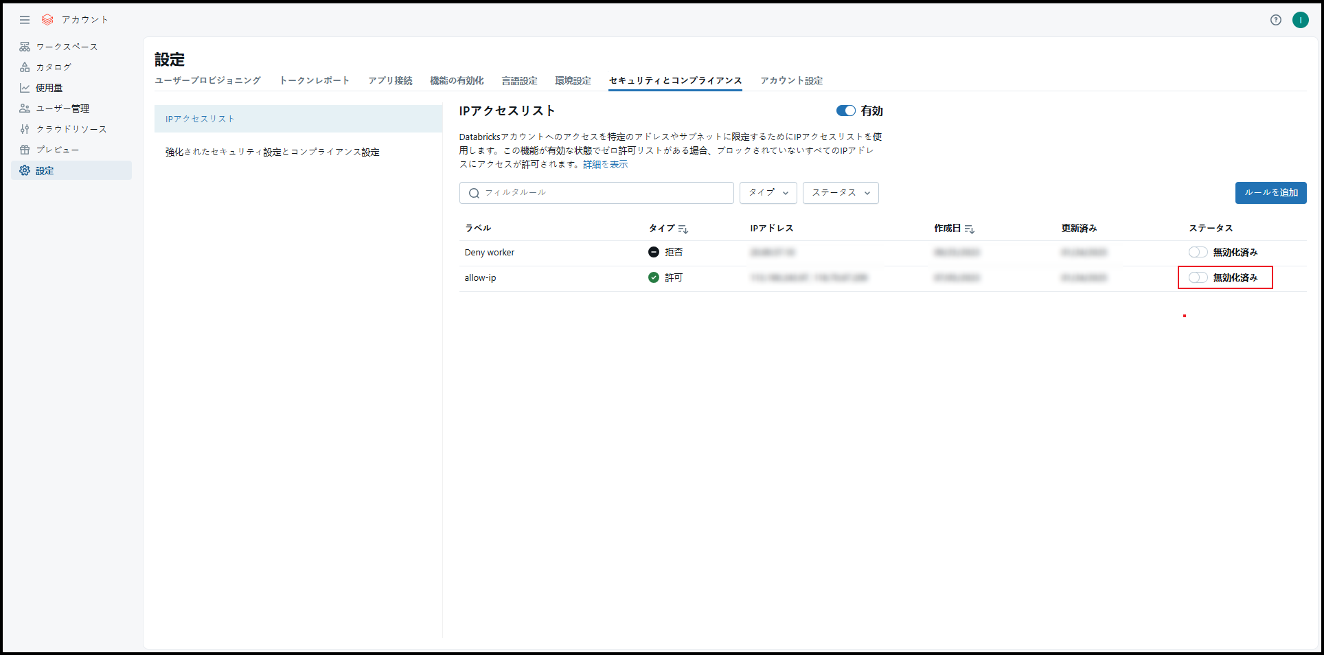 Databricks のアカウントコンソールへのアクセスを許可するIPアドレス範囲を限定するためにIP アクセス リストの使用方法について説明しました。