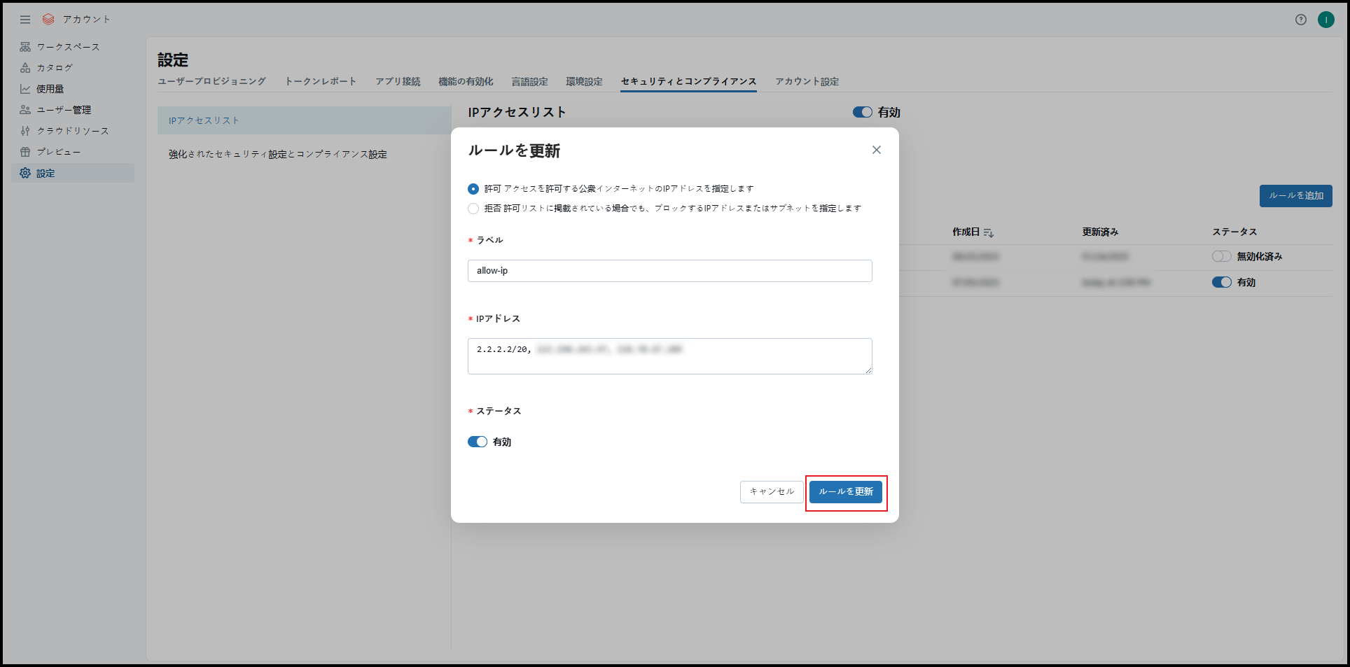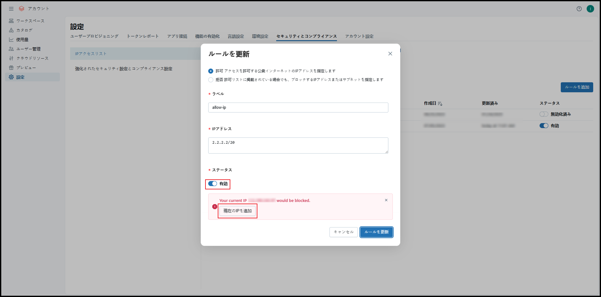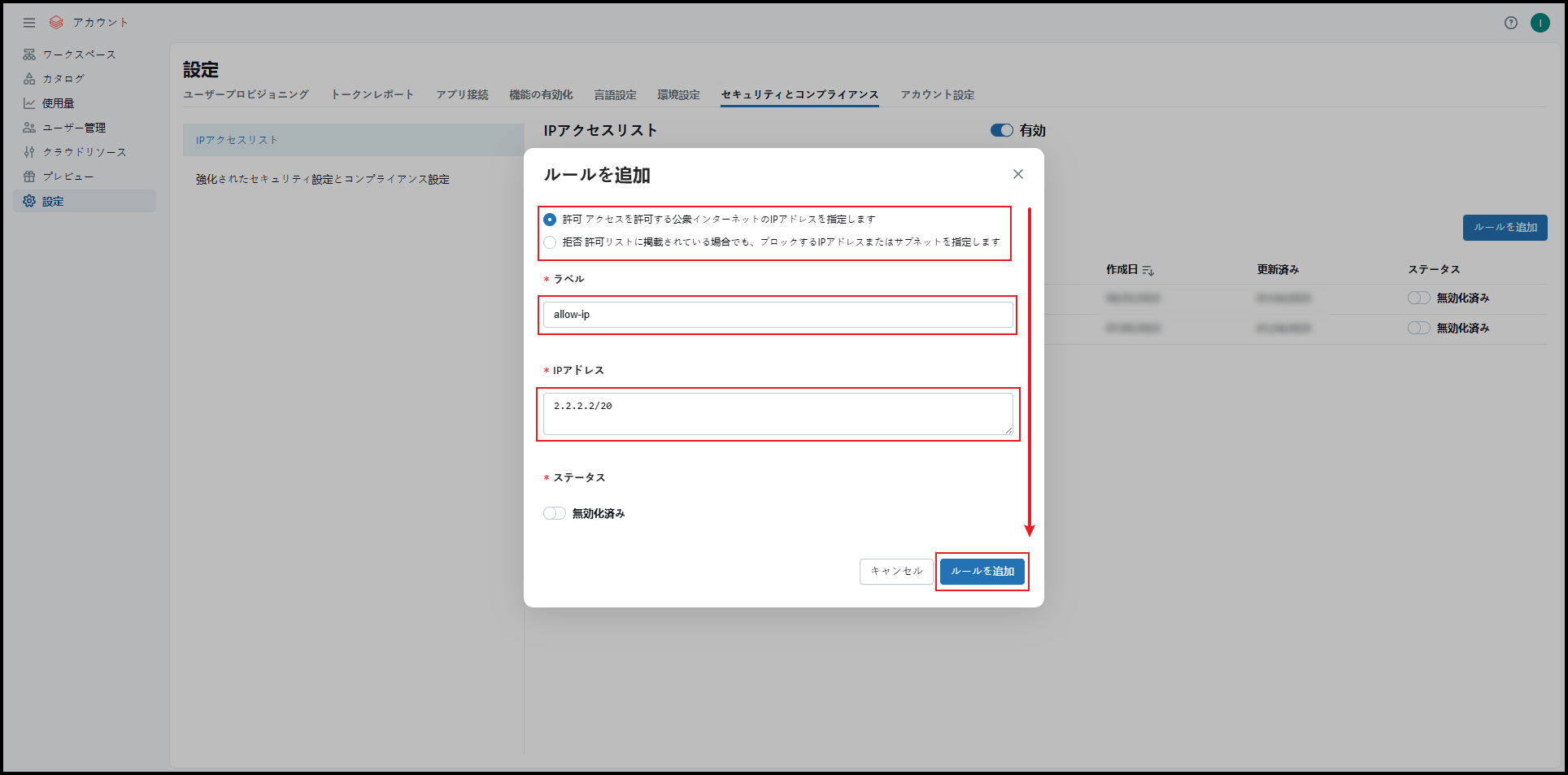 ※ワークスペースのアクセス許可ではありません。ワークスペースについてはAPIを利用してIPアクセスリストを設定する必要があります。