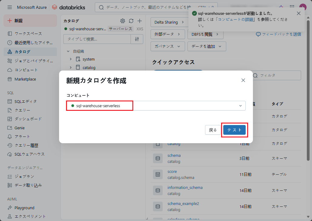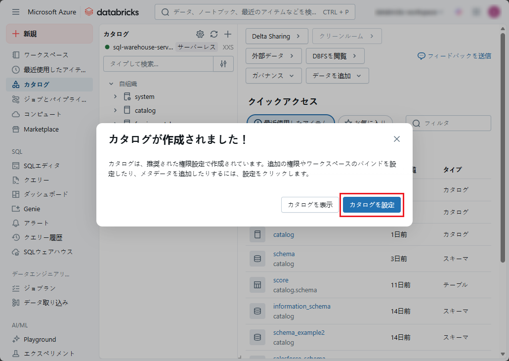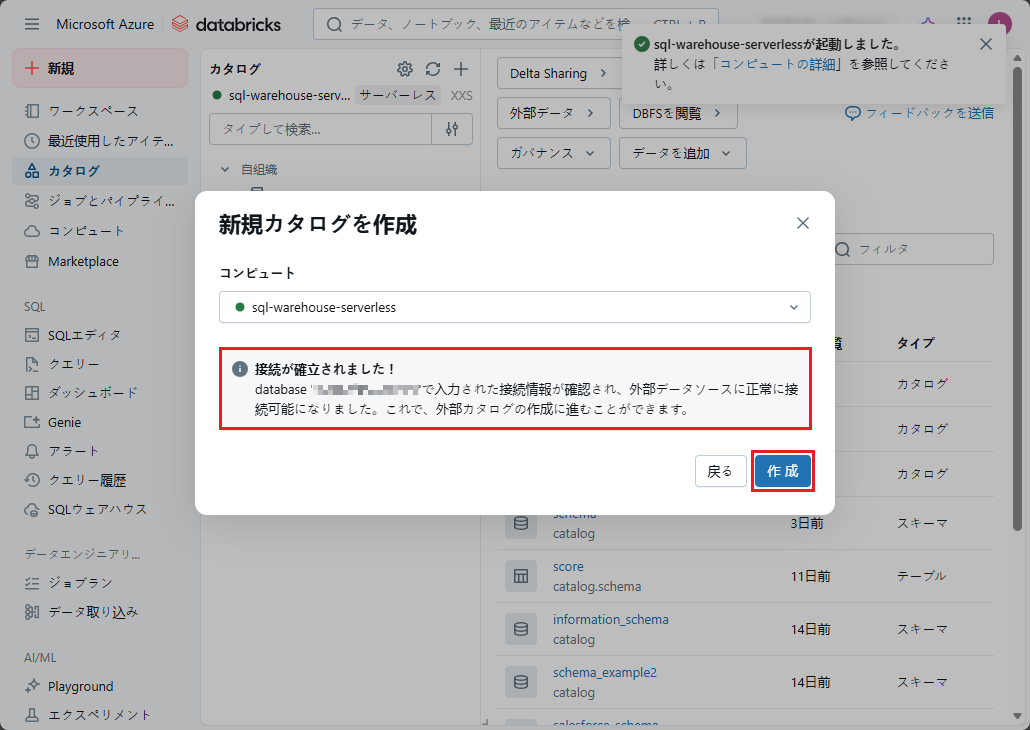 - 「新規カタログを作成」ポップアップが表示されたら、「作成」をクリックして新しい外部カタログを作成します。