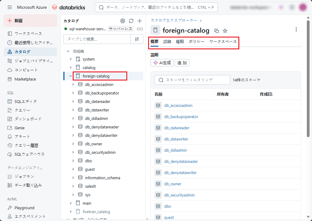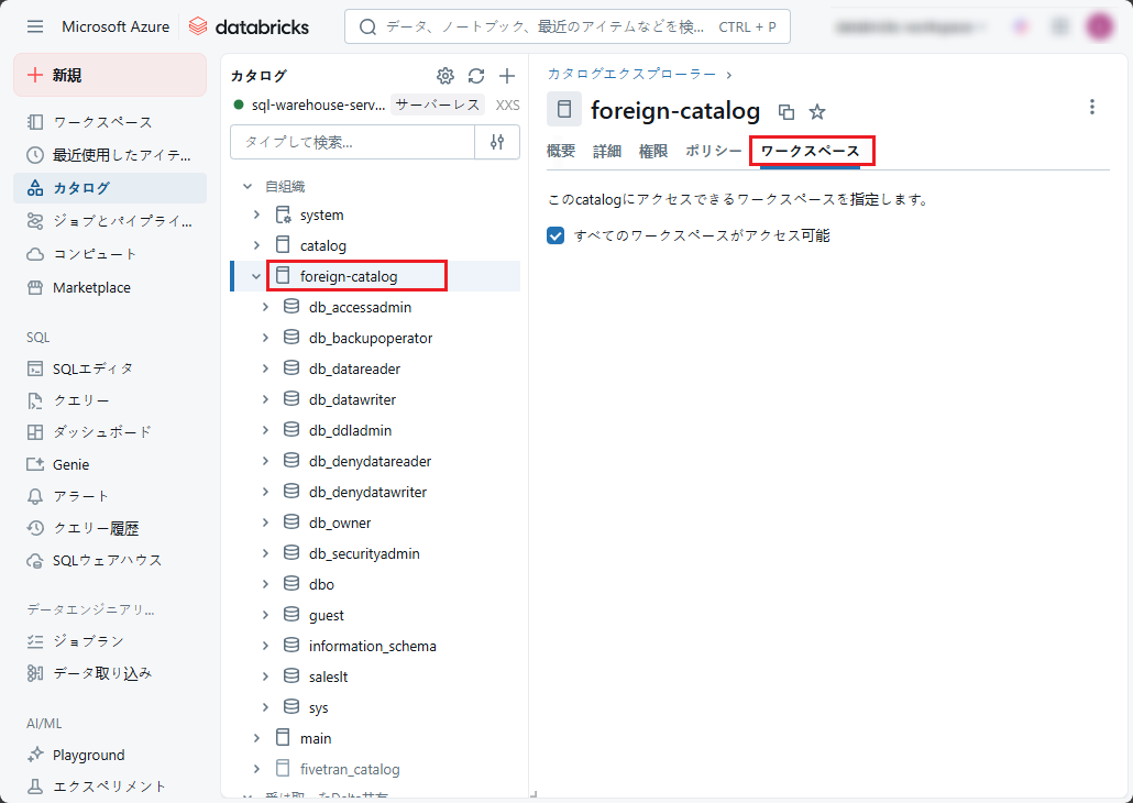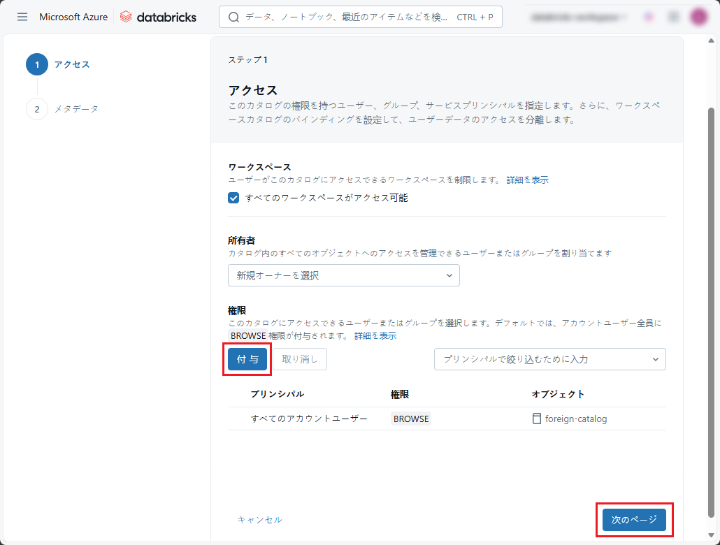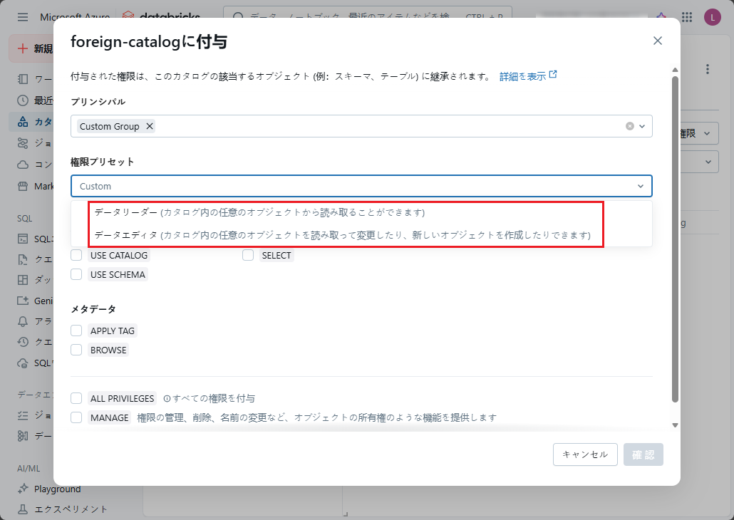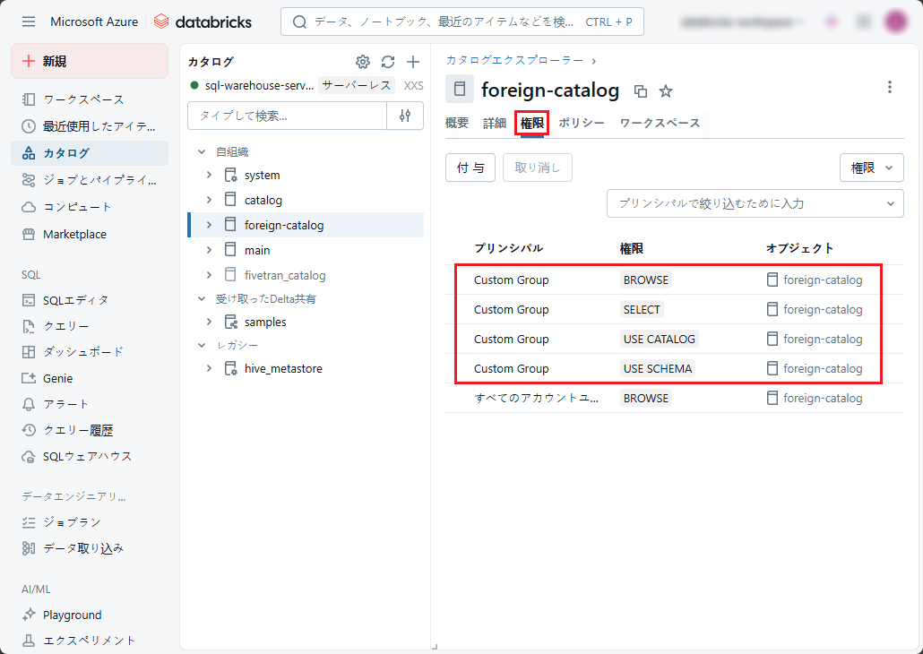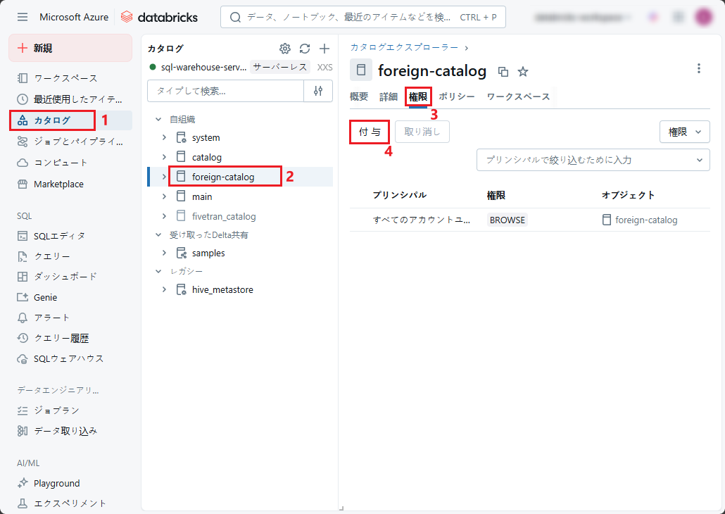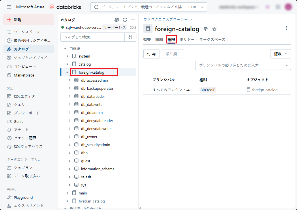 「カタログ」をクリックします。- 許可を与える必要がある「foreign-catalog」を選択します。