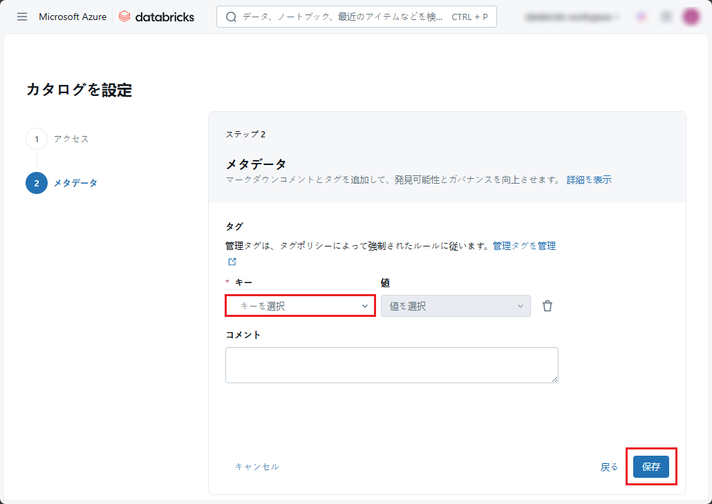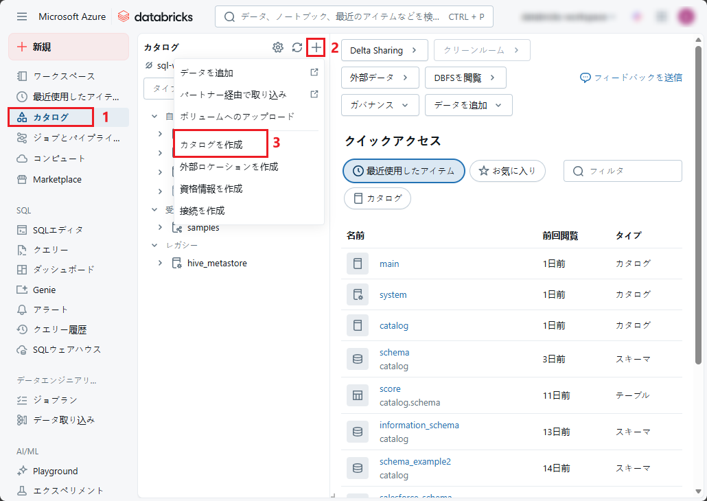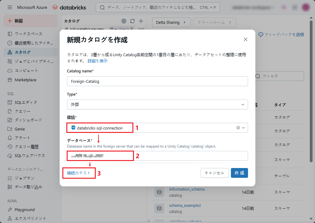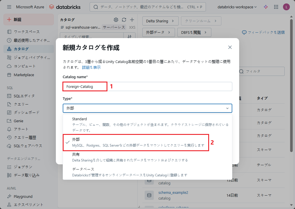 - 「新しいカタログの作成」ダイアログで、「Catalog name*」:カタログ名を入力します。例:「Foreign-Catalog」など