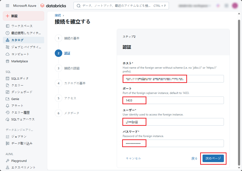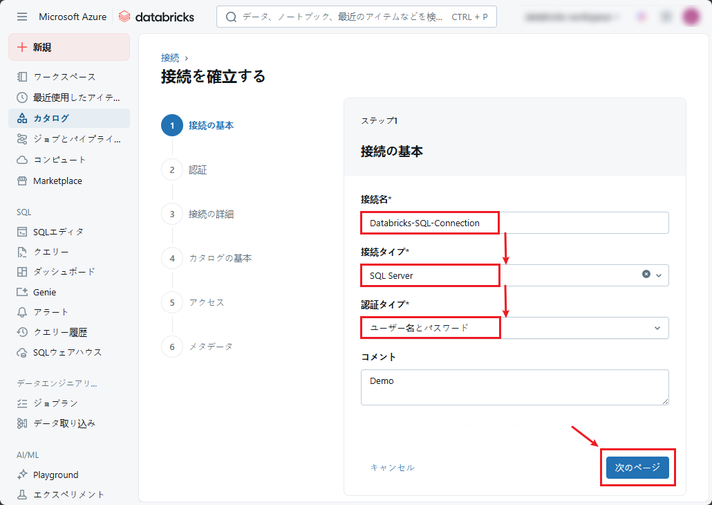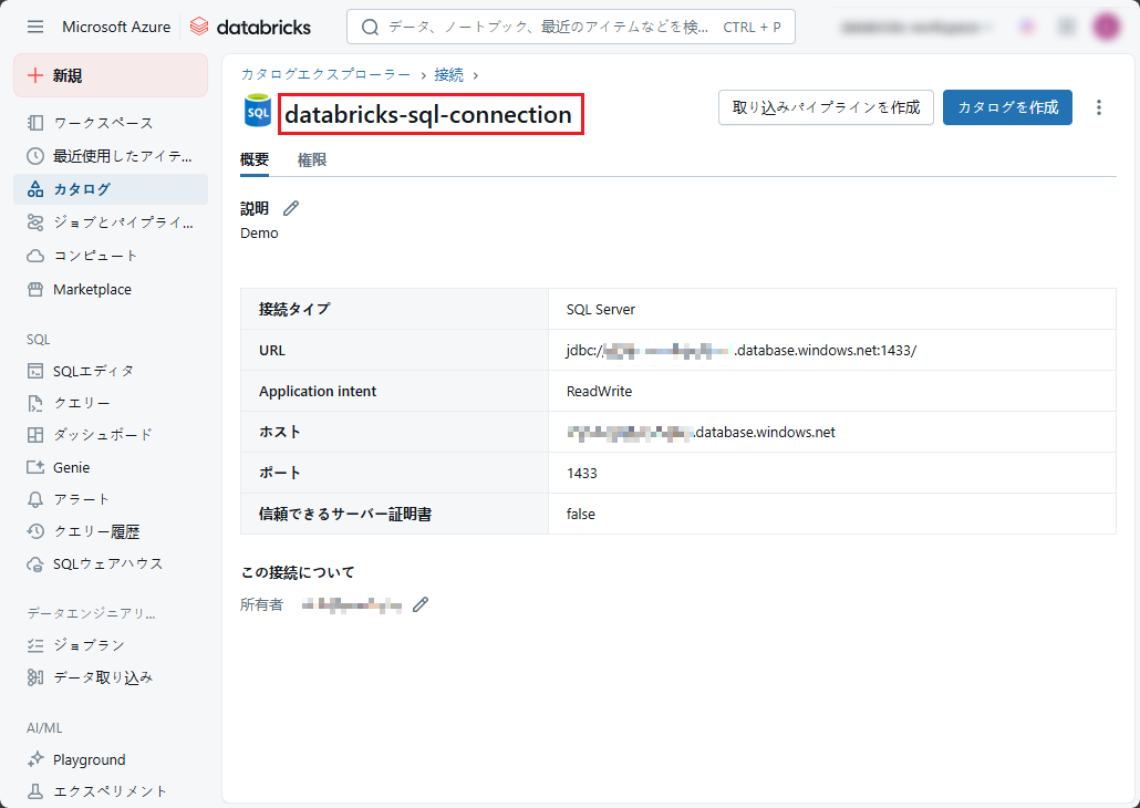 - 「接続名」: 接続名を入力します。 例:Databrick-SQL-Connection