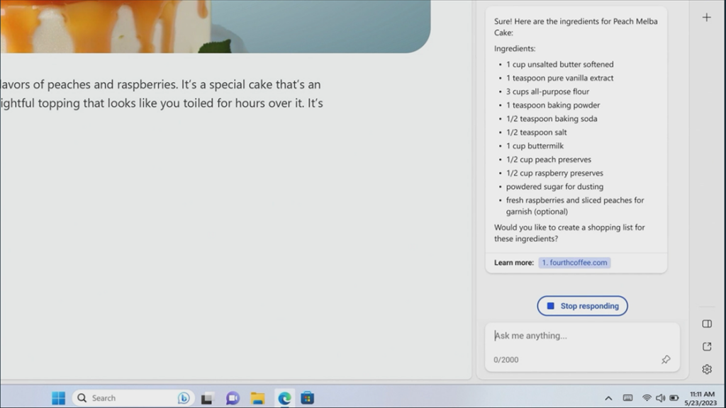 例えば、料理のレシピを見ている際に、Bing Chat に食材リストを作ってとお願いするとリストを作成してくれます。