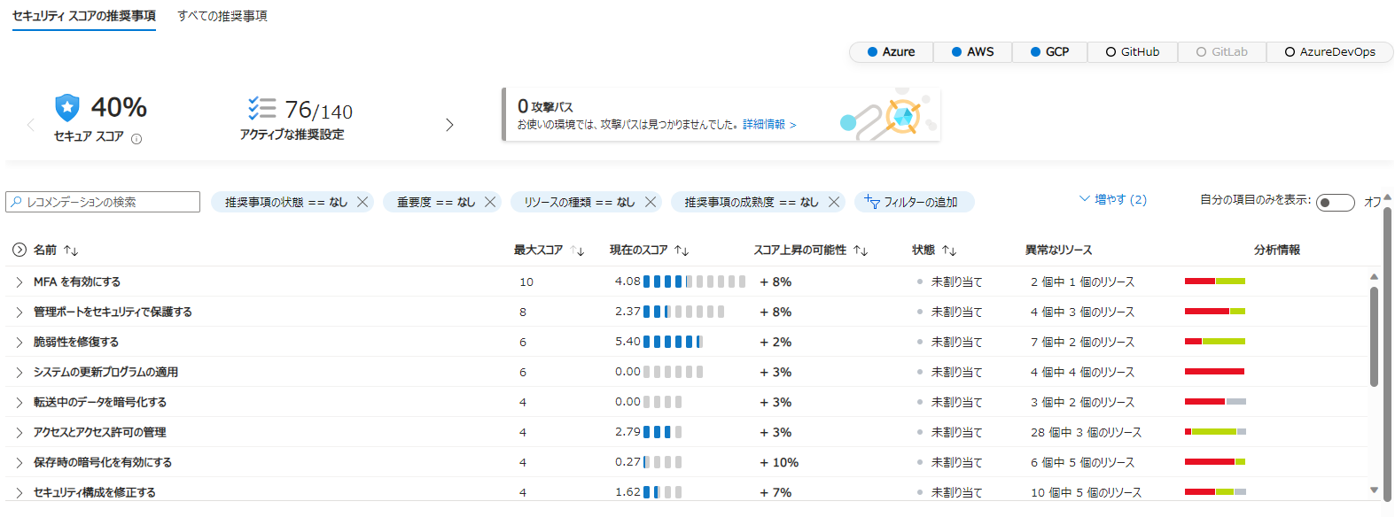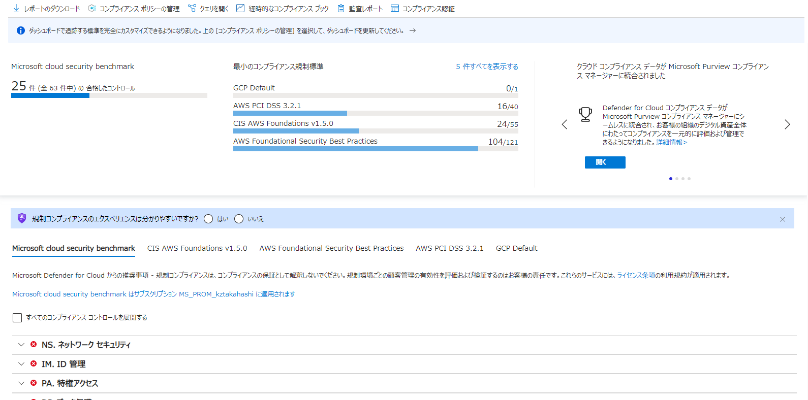 セキュリティとコンプライアンスに関するベストプラクティスに対する評価が表示されます。