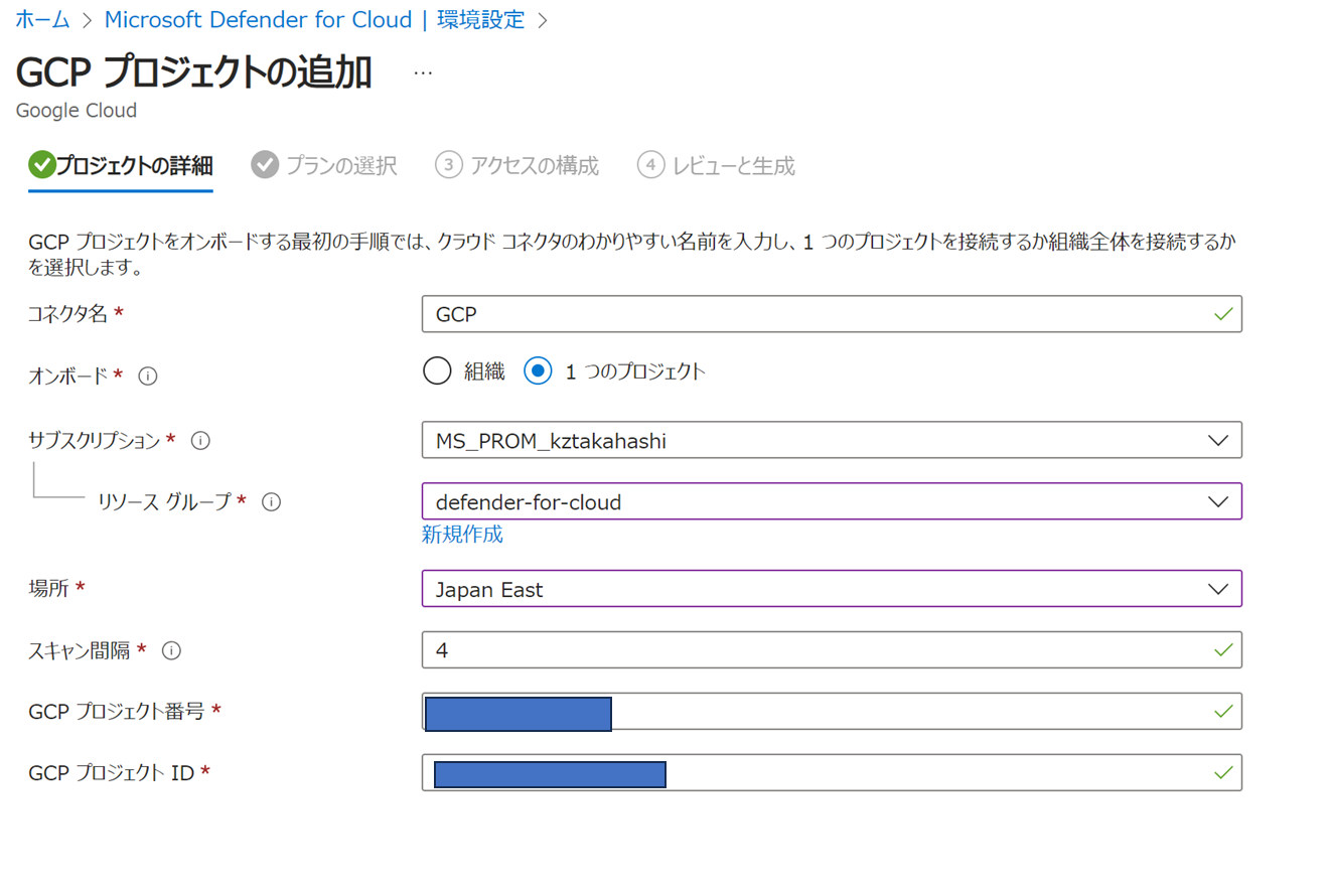 GCPプロジェクト番号とGCPプロジェクトIDを入力します。