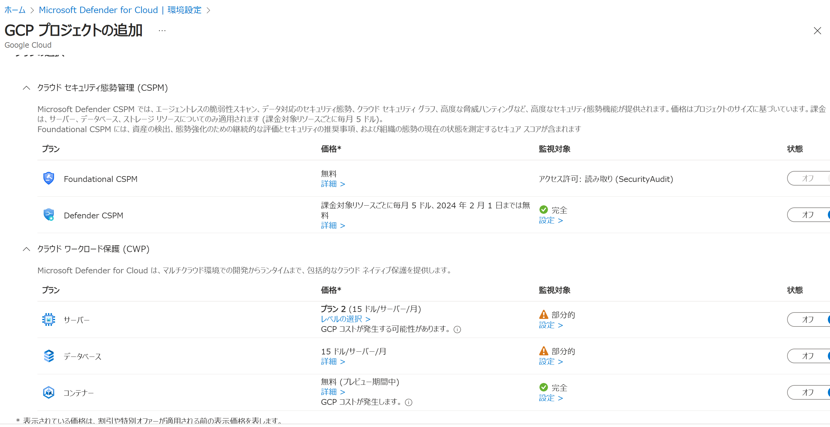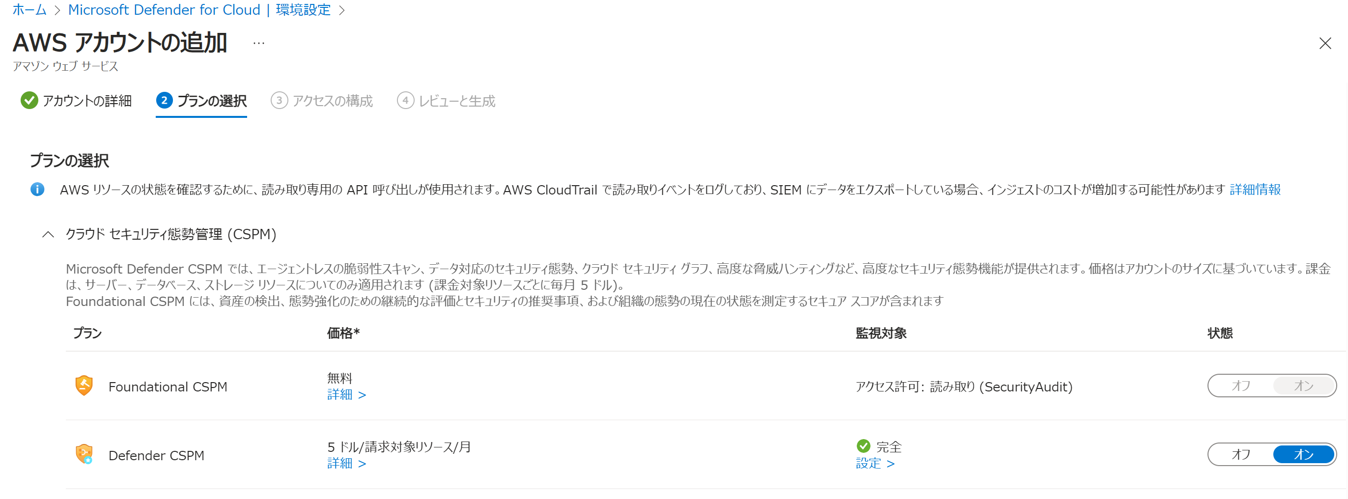 Defender for Cloud のプランを選択します。今回は、「CSPM」「CWPP」のすべての機能をオンにしてみます。