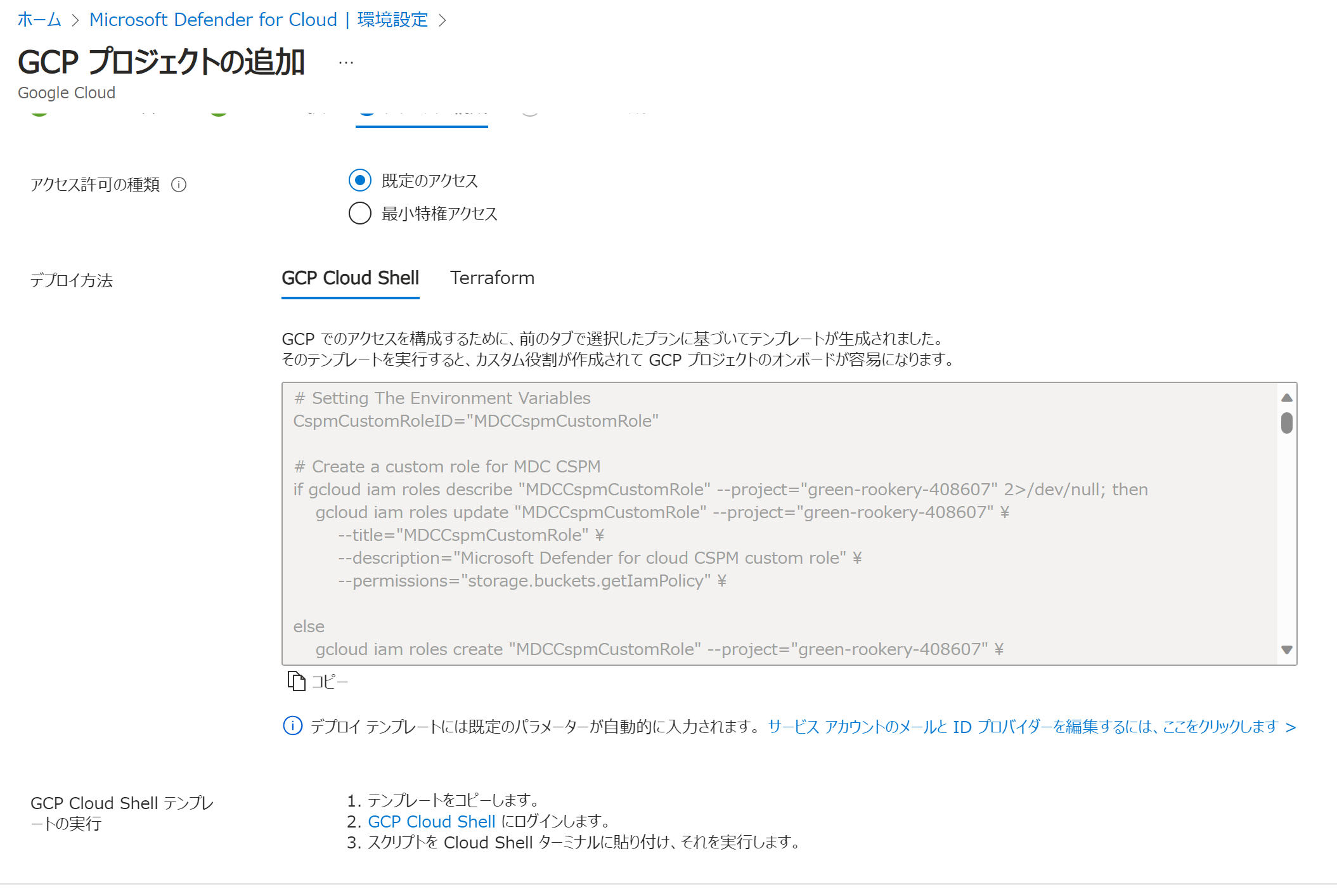 既定のアクセスを選択します。GCP Cloud Shellを選択し、テンプレートのスクリプトをコピーします。その後Cloud ShellをクリックしてGCPのCloudShell上にスクリプトを貼り付けて、実行します。