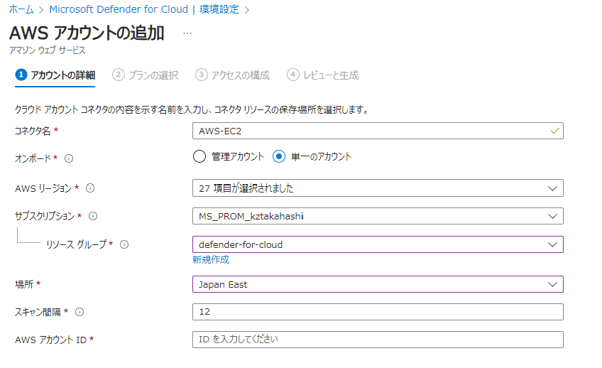 Defender for Cloud > 環境設定 > 環境を追加 から「アマゾン ウェブ サービス」を選択します。